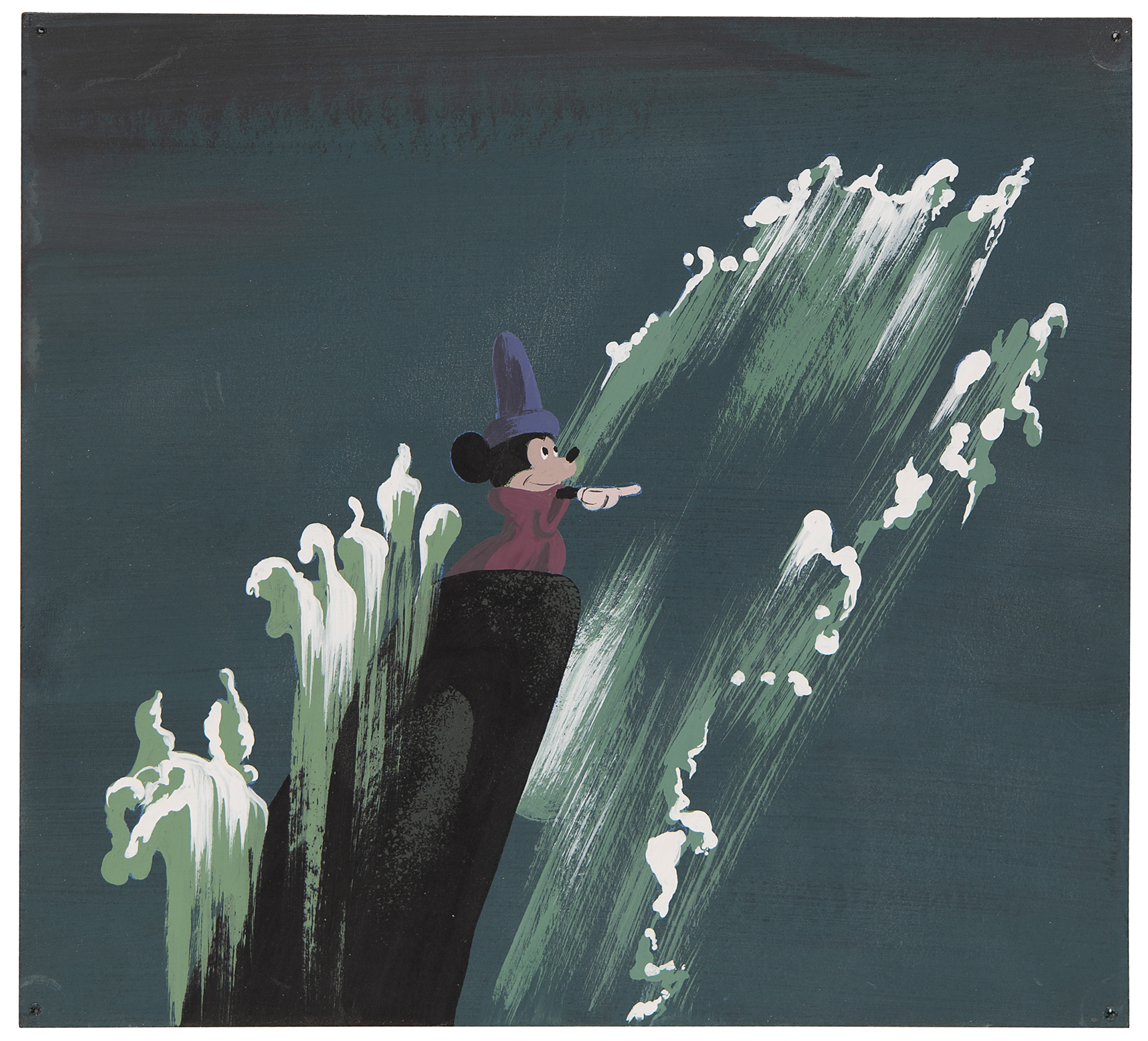 (Walt Disney Studios, 1940) Original concept painting of Mickey Mouse from the 'Sorcerer's Apprentice' segment of Fantasia, showing the young wizard-to-be wearing Sorcerer Yen Sid's magic hat during a dream sequence: standing atop a rocky pinnacle and commanding waves to shoot up all around him. Accomplished in gouache on black 7 x 6.5 artist's board. In fine condition, with tack holes to corners.