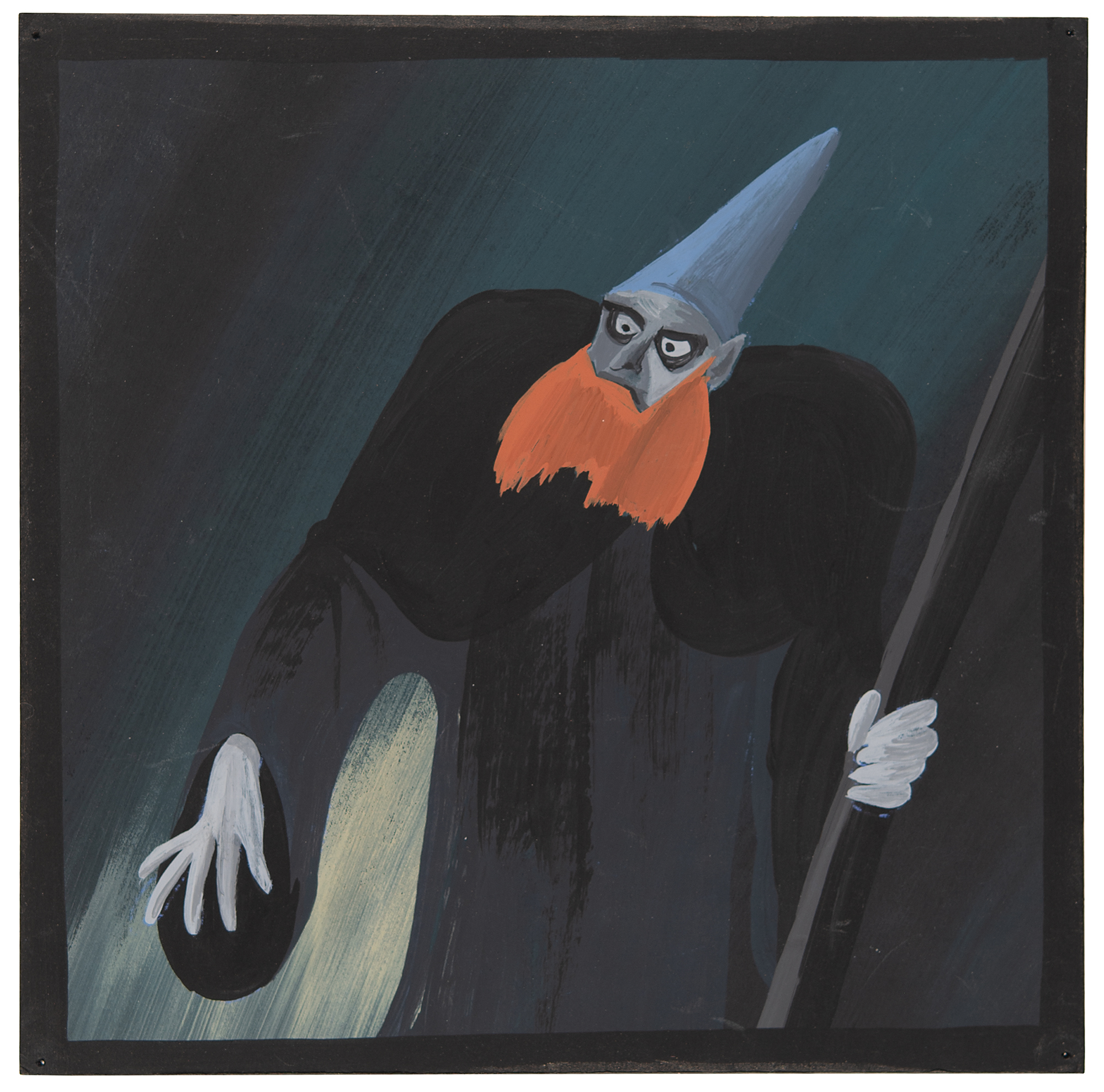 (Walt Disney Studios, 1940) Rare original concept painting of Yen Sid from the 'Sorcerer's Apprentice' segment of Fantasia, showing the powerful sorcerer in an imposing half-length pose with large intense eyes and a glowing orange beard, his left hand gripping a wooden staff, and his head peaked with his magical spired hat. The element of light surrounding the splayed fingers of his right hand suggests that the sorcerer may be performing a spell. Accomplished in gouache on black 6.75 x 6.75 artist's board. In fine condition, with tack holes to corners. Yen Sid remains rare across all early Disney production formats, with this early concept painting proffering an entirely uncommon and unique representation of one of Disney’s most mysterious characters.