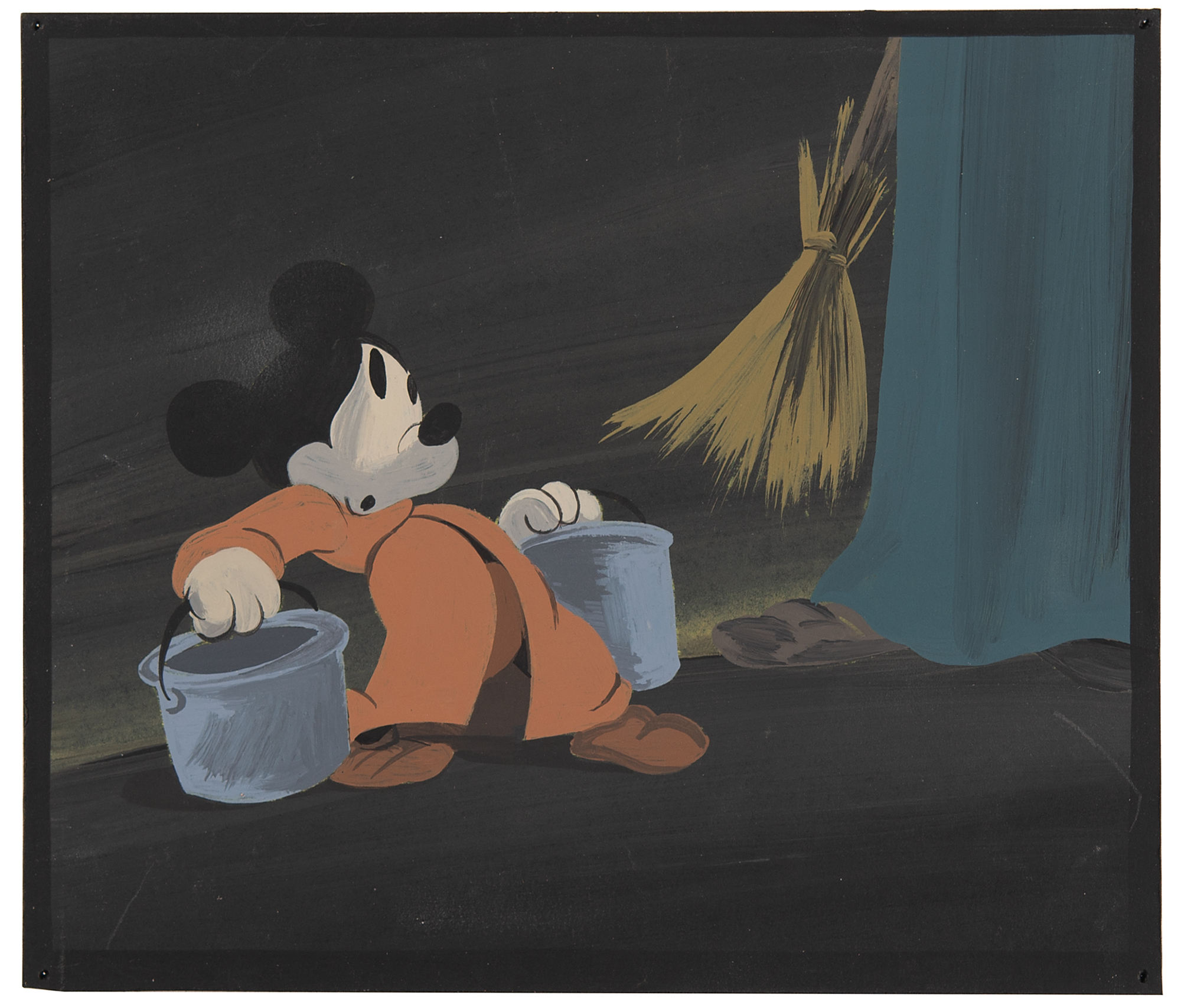 (Walt Disney Studios, 1940) Rare original concept painting of Yen Sid and Mickey Mouse from the 'Sorcerer's Apprentice' segment of Fantasia, which shows Mickey nervously holding two buckets as his master, the powerful sorcerer Yen Sid, stands by with a broom, silently commanding that his pupil begin his cleaning chores. Accomplished in gouache on black 7.25 x 6.25 artist's board. In fine condition, with tack holes to corners. A beautifully rendered concept piece from one of Disney’s most iconic and important films.
