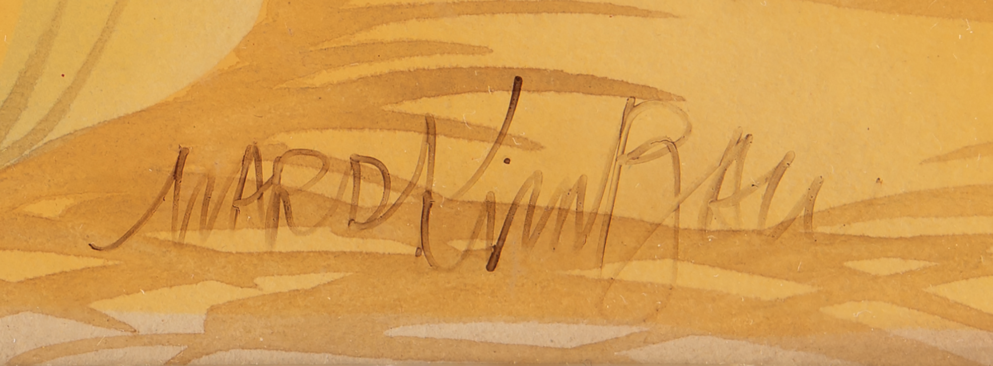 (Walt Disney Studios, 1941) Very attractive original production cel set-up of the Stork and Mrs. Jumbo from Dumbo, which is signed in black felt tip by noted Disney animator Ward Kimball. The cels depict the belated stork in a full-length pose next to Mrs. Jumbo, relieved to have finally been delivered her baby elephant. The cels have been trimmed and applied to a hand-painted background of a hay-strewn train wagon, which was prepared for sale by Courvoisier Galleries. Character images measure 3.5 x 4 (Stork) and 4.75 x 5.25 (Mrs. Jumbo), with a mat opening of 11 x 8.25. Reverse of the background bears two Walt Disney Productions copyright stamps. Double-matted to an overall size of 18 x 15.25. In fine condition, with some light curling to the upper section, and the signature a shade light.