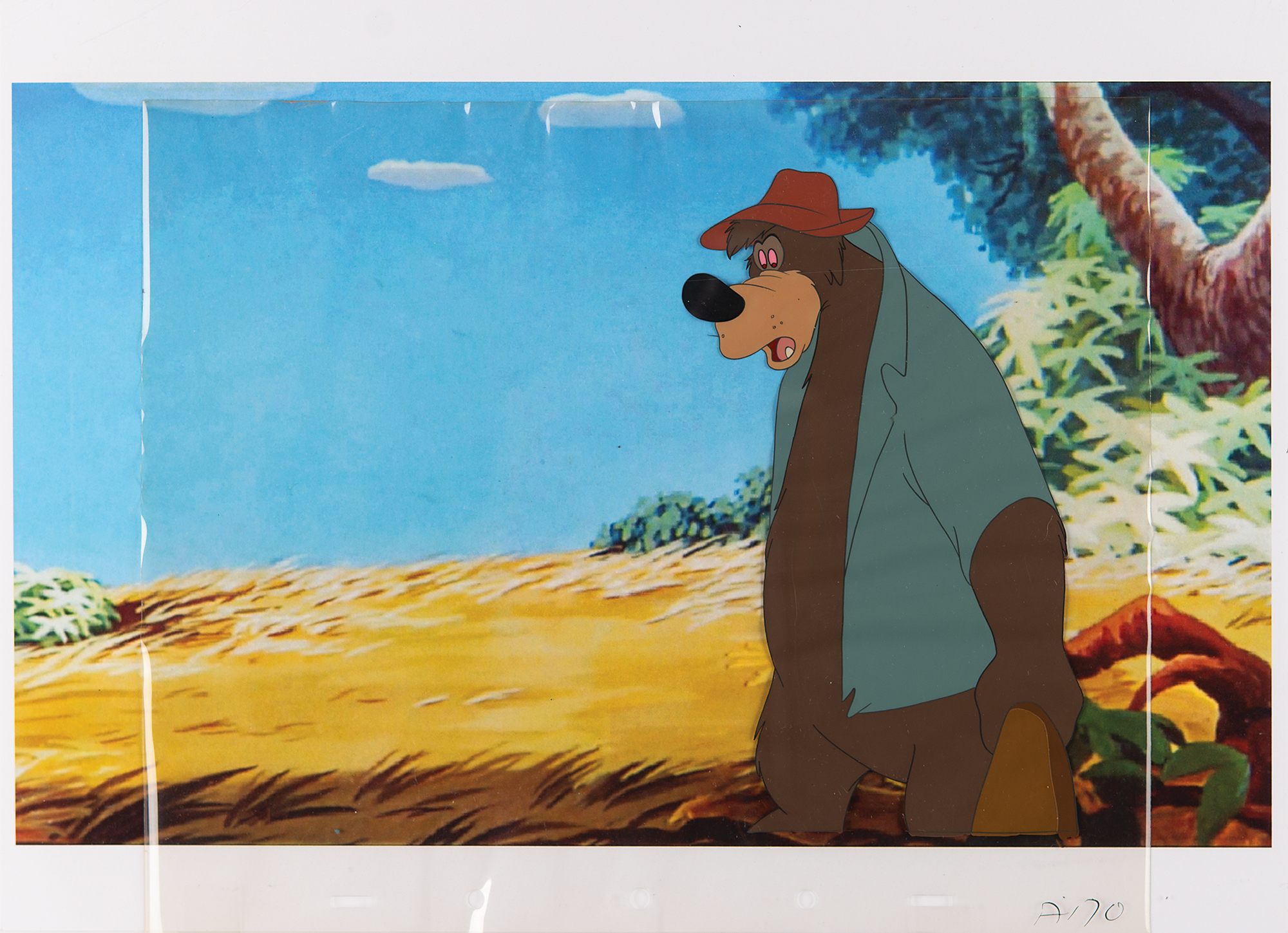 (Walt Disney Studios, 1946) Scarce original production cel of Br'er Bear from Song of the South, depicting the slow-witted antagonist holding his club in a large, nearly full-length pose. The cel, which is marked "A170" in the lower right, is placed on a key master giclee background of a forest, field, and blue sky. Image measures 4 x 7.75, with overall dimensions of 15.25 x 11. In fine condition, with light rippling to the slightly trimmed cel edges.