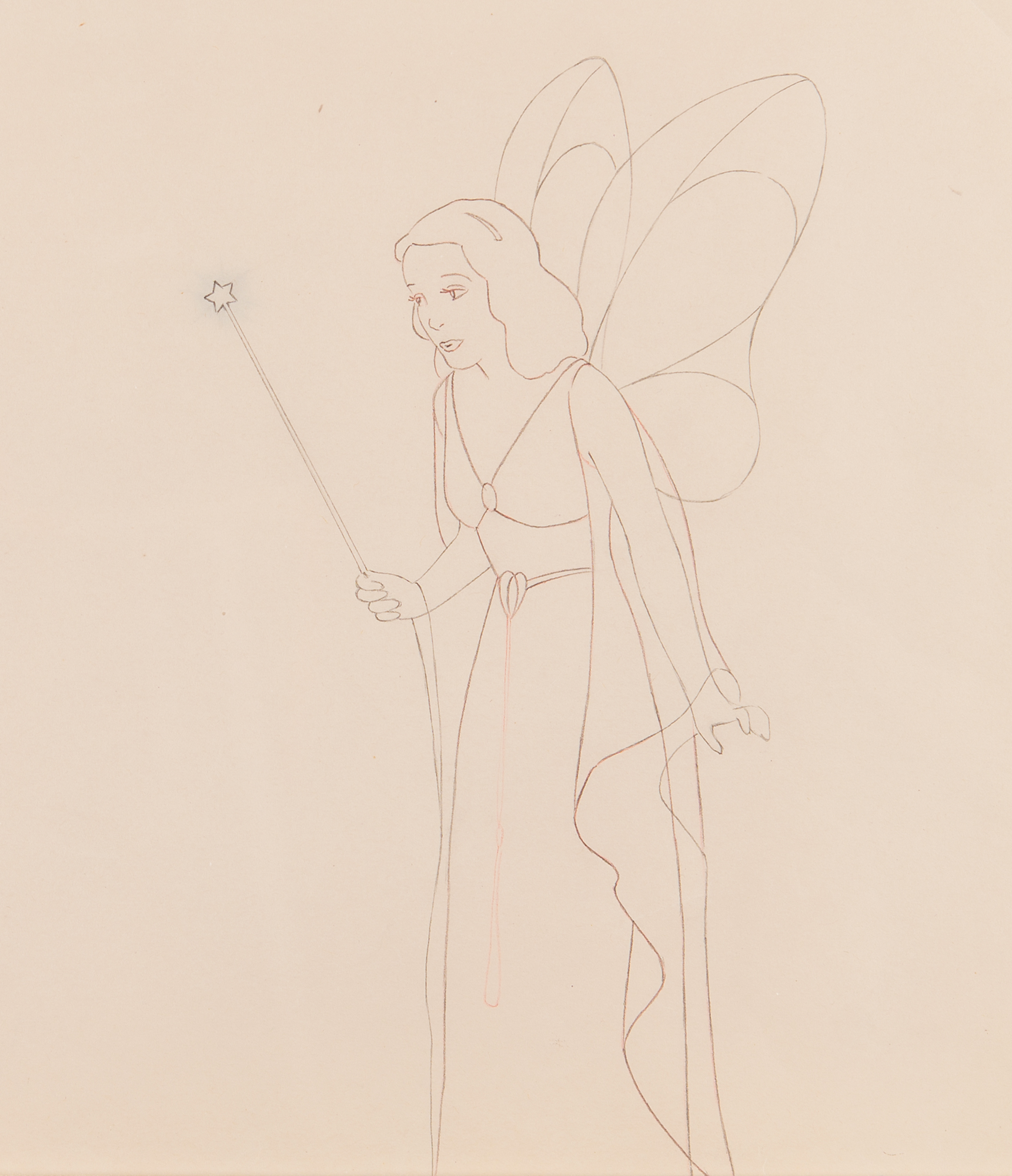 (Walt Disney Studios, 1940) Sought-after original production drawing of the Blue Fairy from Pinocchio, which shows the benevolent wishmaker in a splendid full-length pose with upright wings and her magic wand. Accomplished in graphite and colored pencil on animation paper, with the image measuring 4 x 7. Double-matted and framed to an overall size of 18.5 x 17. In fine condition.