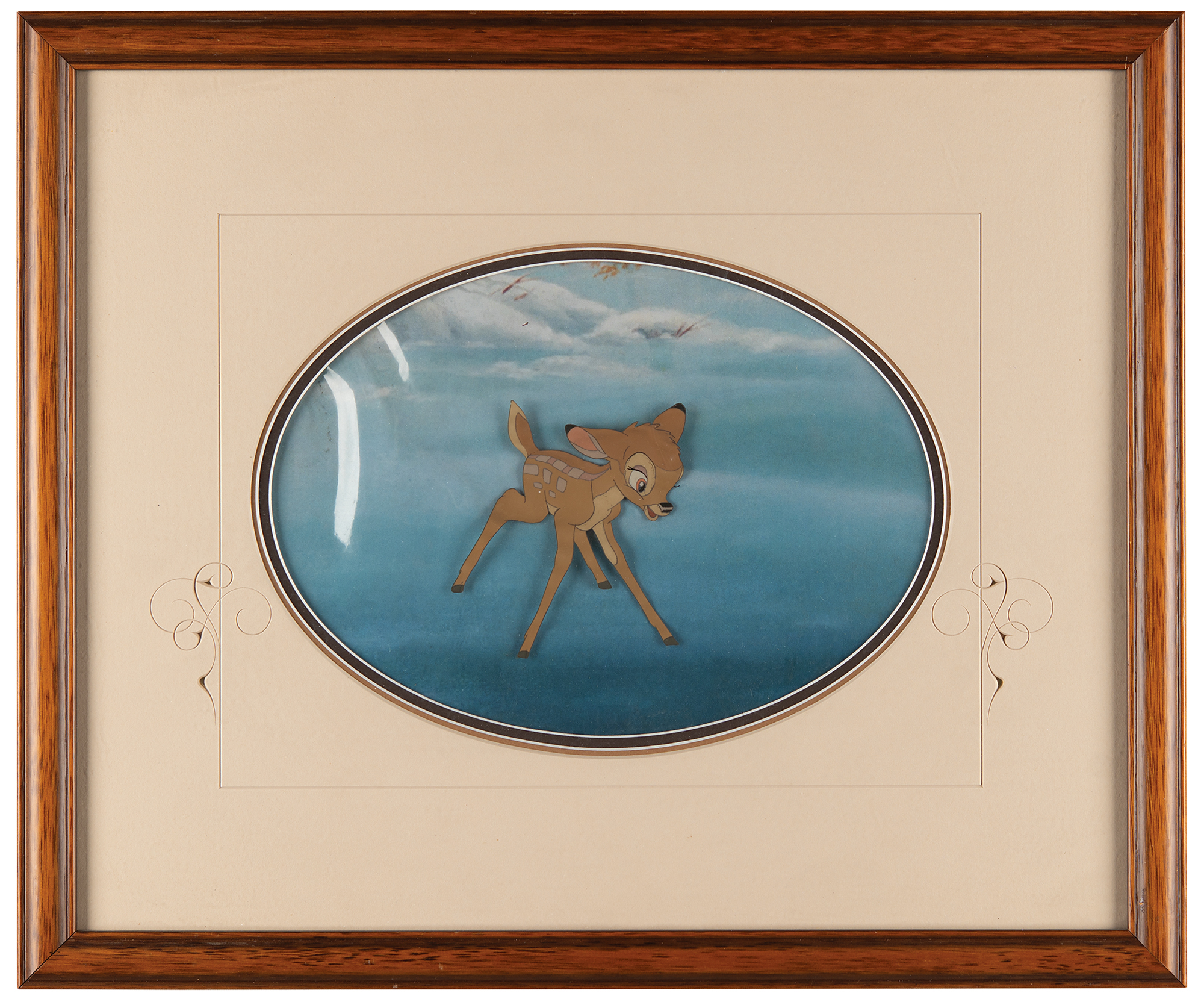 (Walt Disney Studios, 1942) Original production cel of Bambi from the Oscar-nominated film of the same name, showing the beloved young deer enjoying a romp on some slippery ice. The cel is placed on a matching color print of a frozen pond. Image measures 4 x 4, with a mat opening of 10.5 x 7.5. Triple-matted and framed to an overall size of 18.5 x 15.5. In fine condition.