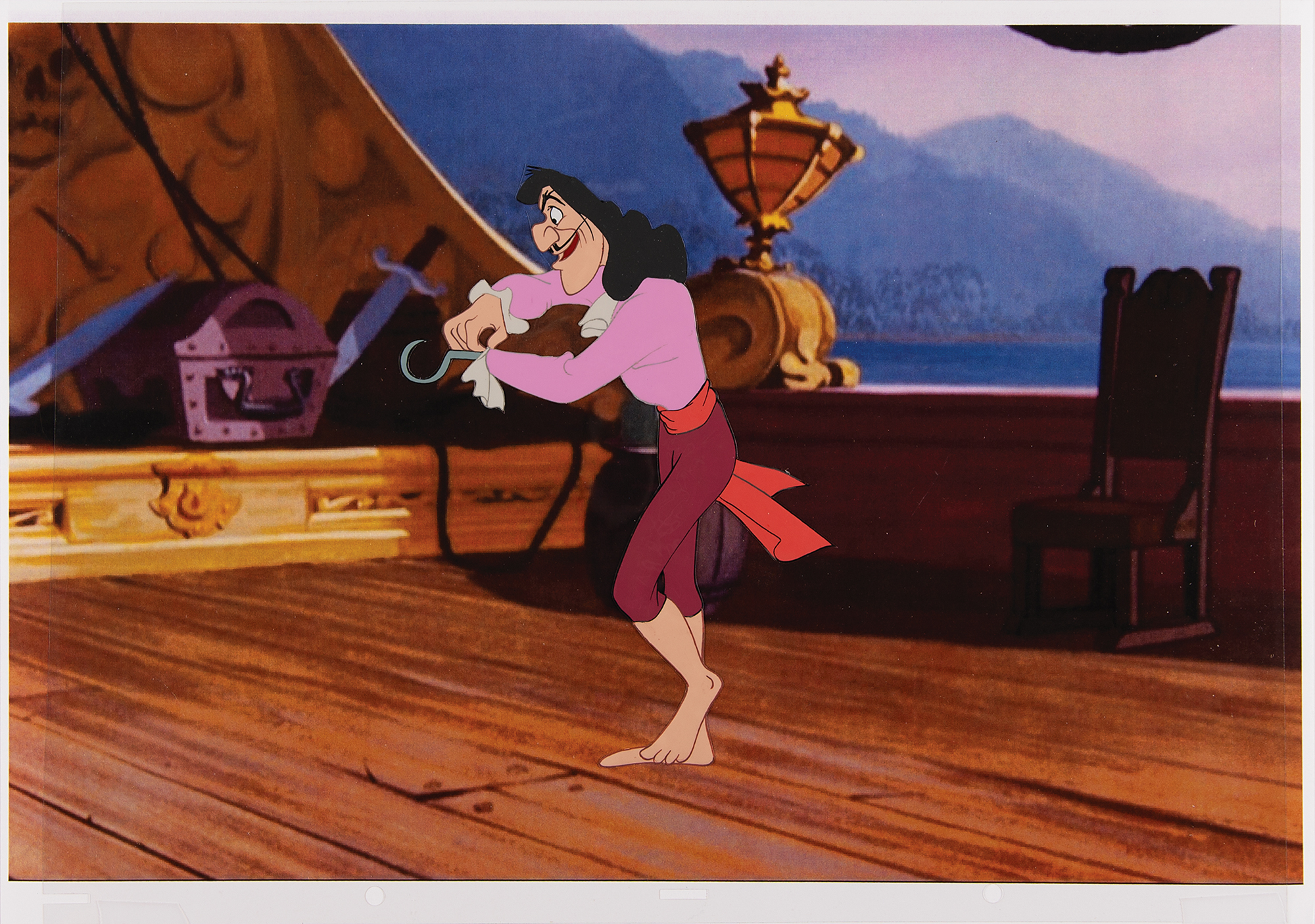(Walt Disney Studios, 1953) Original production cel of Captain Hook from Peter Pan, depicting the Neverland villain in a great full-length profile pose, his feet bare and his right hand adjusting the sleeve near his notorious hook. The cel has been trimmed to the image and applied to a clear overlay cel, which has been placed on a color giclee background of the Jolly Roger pirate ship. Image measures 5.5 x 7.75. In fine condition.