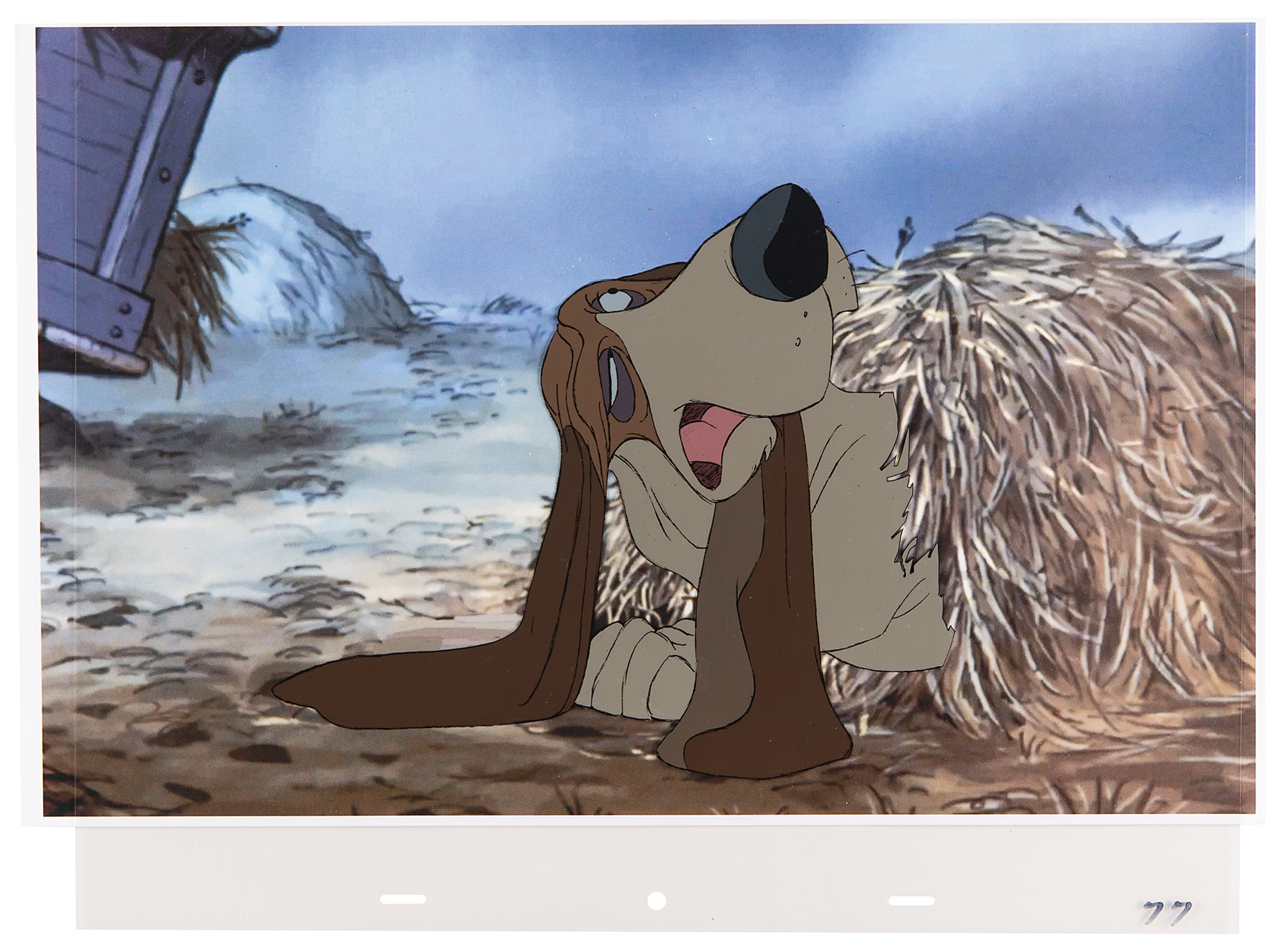 (Walt Disney Studios, 1970) Original production cel of Lafayette from The Aristocats, depicting the hound dog in a weary half-length pose. The cel, which is marked “77” in the lower right corner, is placed on a matching color giclee background of a pile of hay. Image measures 9.5 x 8, with overall dimensions of 17 x 12.5. In fine condition.