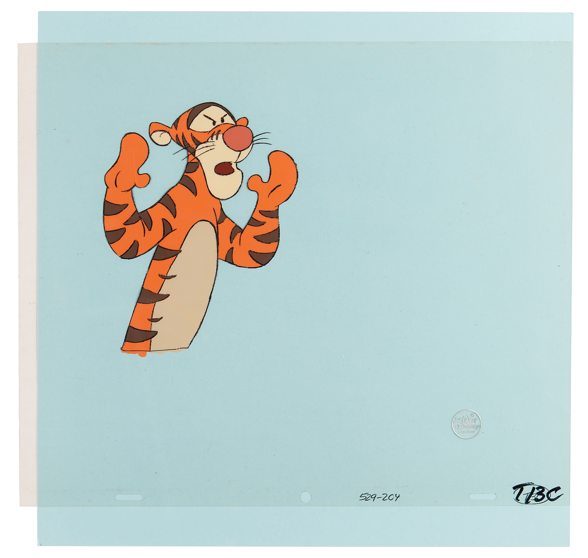 (Walt Disney Studios, 1988) Original production cel of Tigger from The New Adventures of Winnie the Pooh, showing the stuffed toy tiger with a frustrated expression in a half-length pose. Image measures 4.5 x 5.5, with overall dimensions of 12.5 x 10.5; the lower right of the cel bears a silver Walt Disney Company seal, and the bottom edge is marked "529-204, T13C." In very good to fine condition, with numerous horizontal waves or lines to the cel.