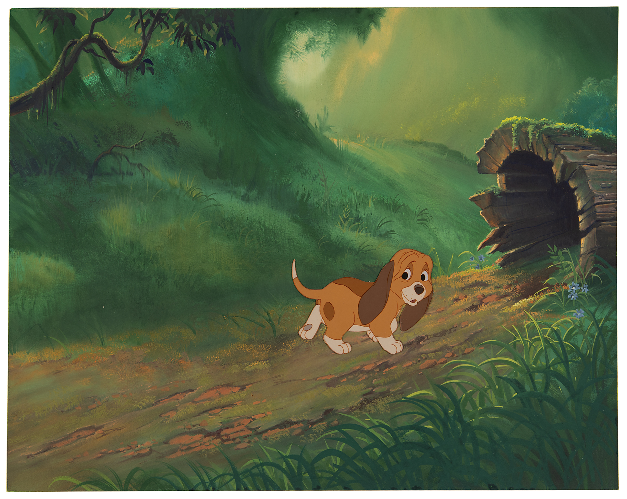 (Walt Disney Studios, 1981) Original production cel and preliminary production background featuring Copper from The Fox and the Hound, which shows the hound puppy in a full-figure walking as he heads into the opening of a large down log. The Copper cel is trimmed to size and applied to a beautiful hand-painted preliminary background of a lush forest. The character image measures 4 x 2.75, with overall dimensions of 16.25 x 12.5. In fine condition.