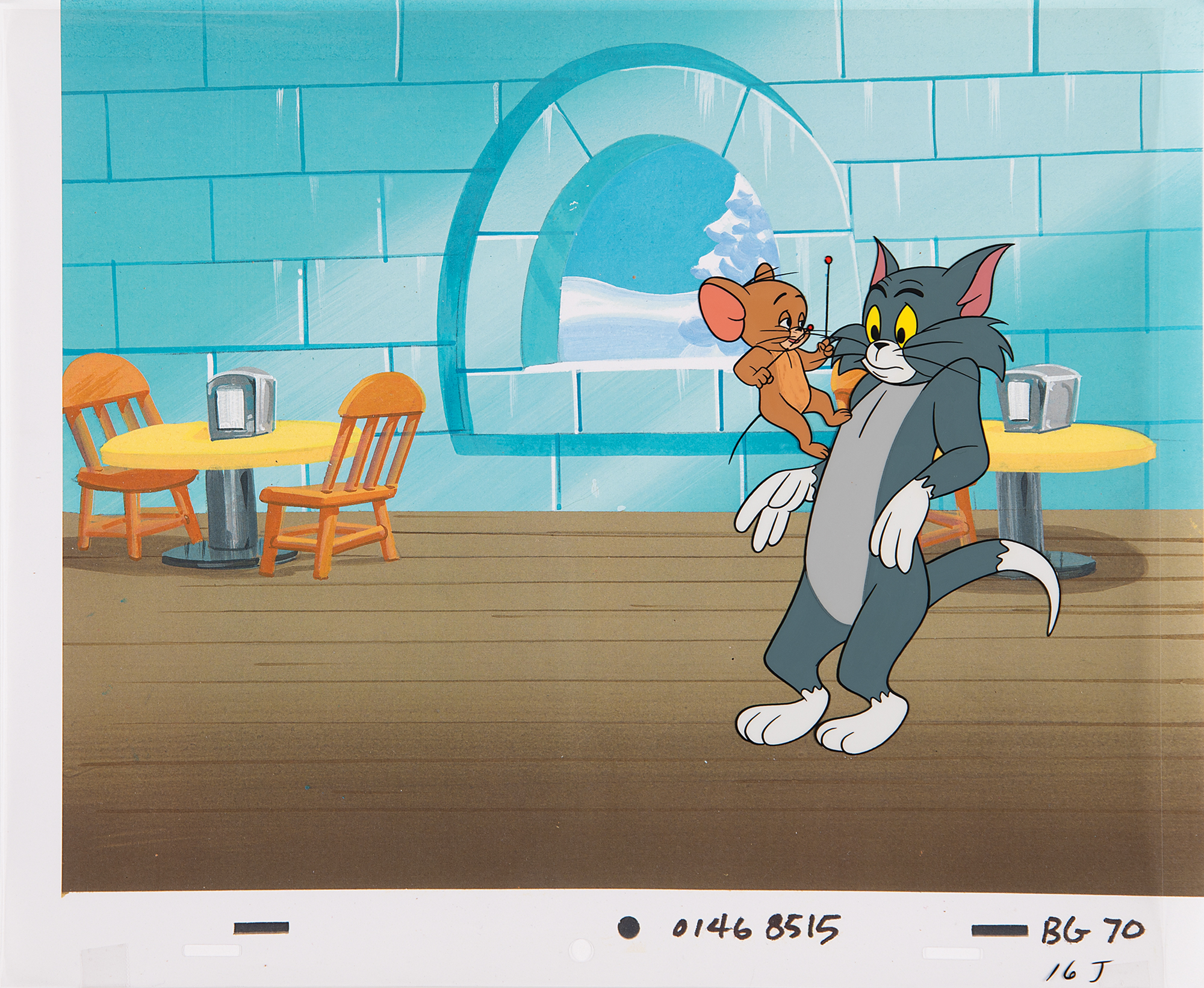 (MGM Animation, 1960s) Original production cel of Tom and Jerry from a Chuck Jones television cartoon, which shows Jerry standing on the chest of his much larger feline adversary. The cel, which is marked as “16 J” in the lower right, is placed on a color copy background of the interior of a fancy igloo restaurant. Total character image measures 4 x 5.75, with overall dimensions of 13 x 10.75. In fine condition.