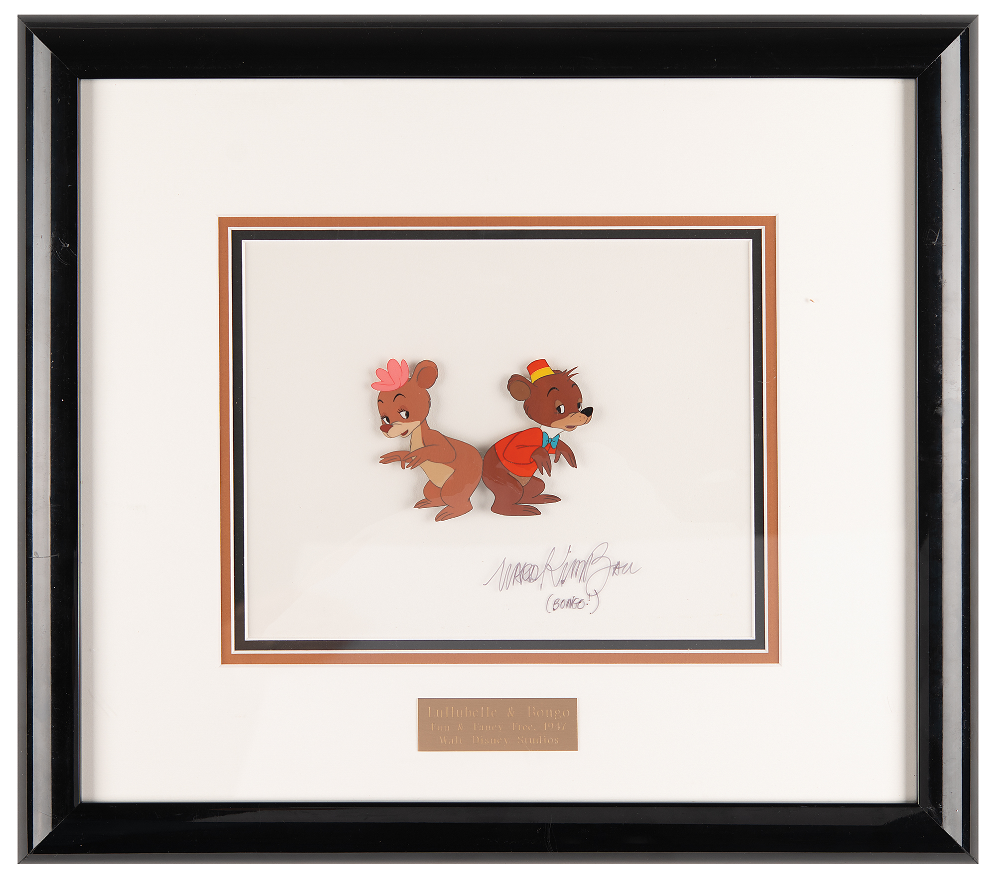 (Walt Disney Studios, 1947) Original production cel of Bongo and Lulubelle from the animated anthology film Fun and Fancy Free, which is signed in black felt tip by Ward Kimball, who adds “(Bongo!).” The image, which shows the two bears rear-to-rear in full-length poses, measures 4.25 x 3, with a mat opening of 9.5 x 7.5. Triple-matted and framed to an overall size of 18.25 x 16.25. In fine condition.