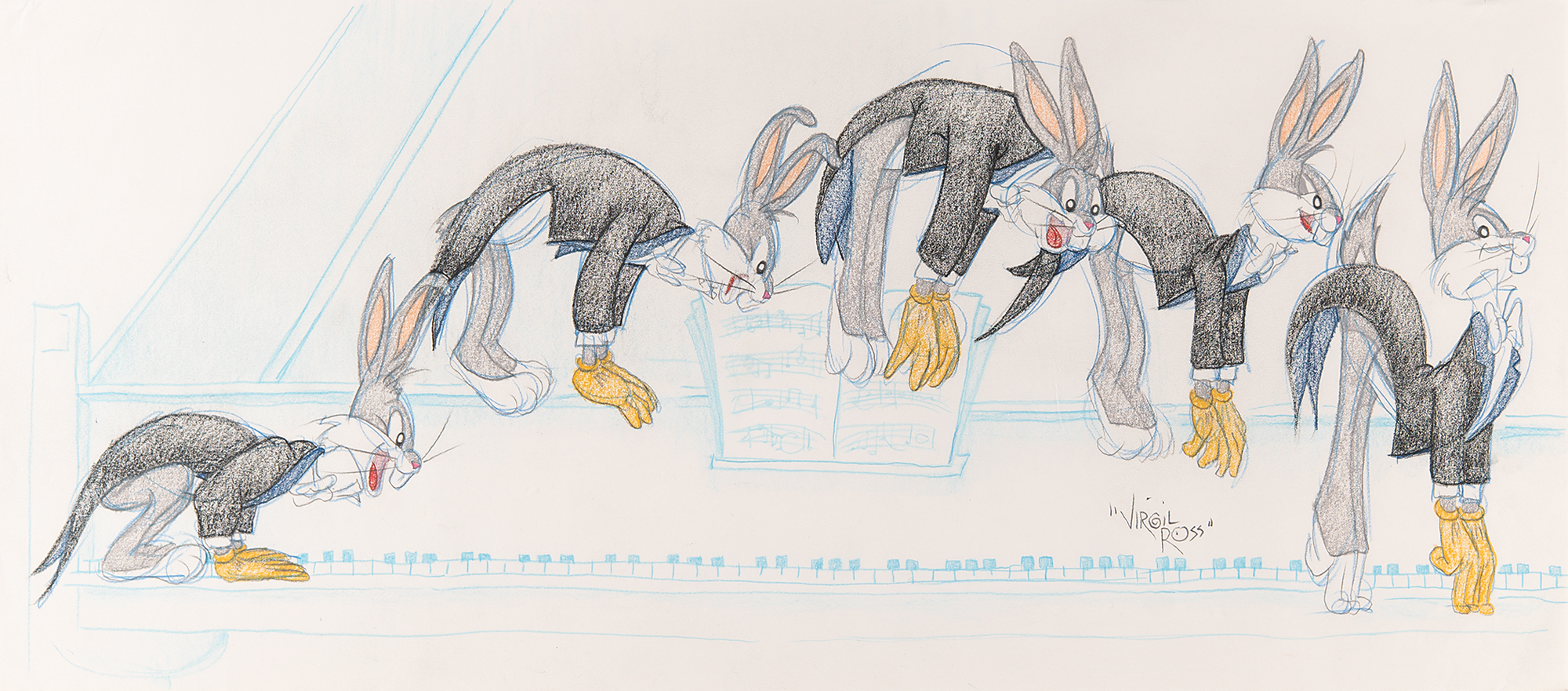 (Warner Brothers Studios, 1990s) Original panoramic drawing by Virgil Ross of Bugs Bunny in five different sequential leaping poses, showing the musically inclined rabbit wearing a tuxedo and hopping on the keys of a piano, a scene inspired by the classic 1946 short Rhapsody Rabbit. Accomplished in graphite and colored pencil on off-white 24 x 10.5 animation paper, signed at the bottom in pencil, "Virgil Ross." Rolled and in fine condition, with slightly trimmed edges. This one-of-a-kind drawing was done to be sold in the Warner Brothers Studio stores in the 1990s.