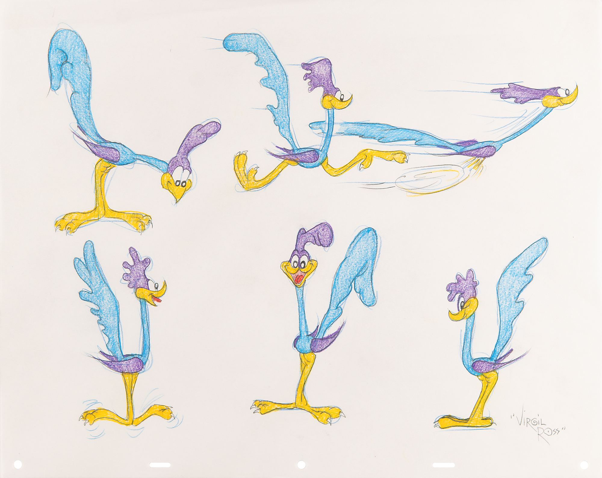 (Warner Brothers Studios, circa 1990s) Original color model drawing by Virgil Ross featuring the Road Runner in six different and very amusing poses. Accomplished in graphite and colored pencil on untrimmed 17 x 13.5 animation paper, signed at the bottom in pencil, "Virgil Ross." In fine condition, with a crease along the upper left edge. This one-of-a-kind drawing was done to be sold in the Warner Brothers Studio stores in the 1990s.