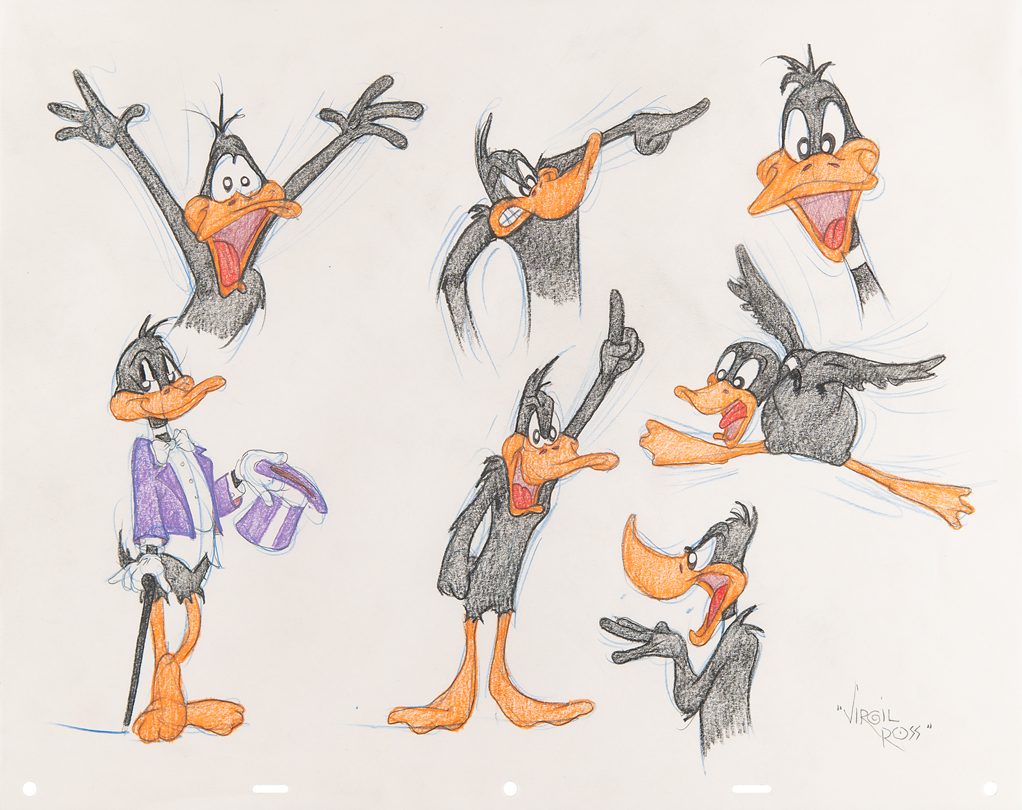 (Warner Brothers Studios, circa 1990s) Original color model drawing by Virgil Ross featuring Daffy Duck in seven different and amusing poses that display his varying degrees of emotion. Accomplished in graphite and colored pencil on untrimmed 17 x 13.5 animation paper, signed at the bottom in pencil, "Virgil Ross." In fine condition. This one-of-a-kind drawing was done to be sold in the Warner Brothers Studio stores in the 1990s.