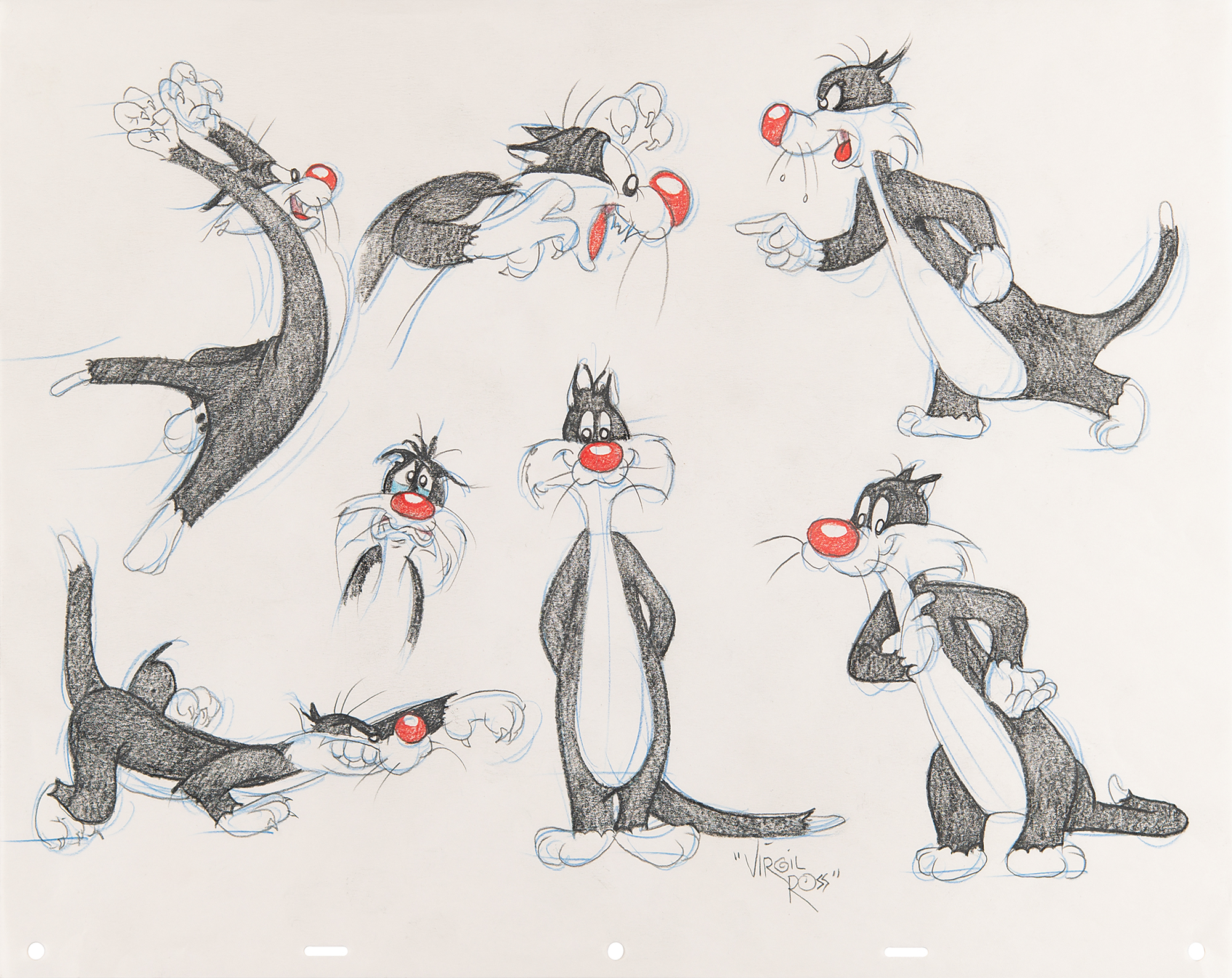 (Warner Brothers Studios, 1990s) Original model sheet drawing by Virgil Ross featuring Sylvester the Cat in seven different poses, including five full-length portrayals of him in action. Accomplished in graphite and colored pencil on untrimmed 17 x 13.5 animation paper, signed at the bottom in pencil, "Virgil Ross." In fine condition. This one-of-a-kind drawing was done to be sold in the Warner Brothers Studio stores in the 1990s.