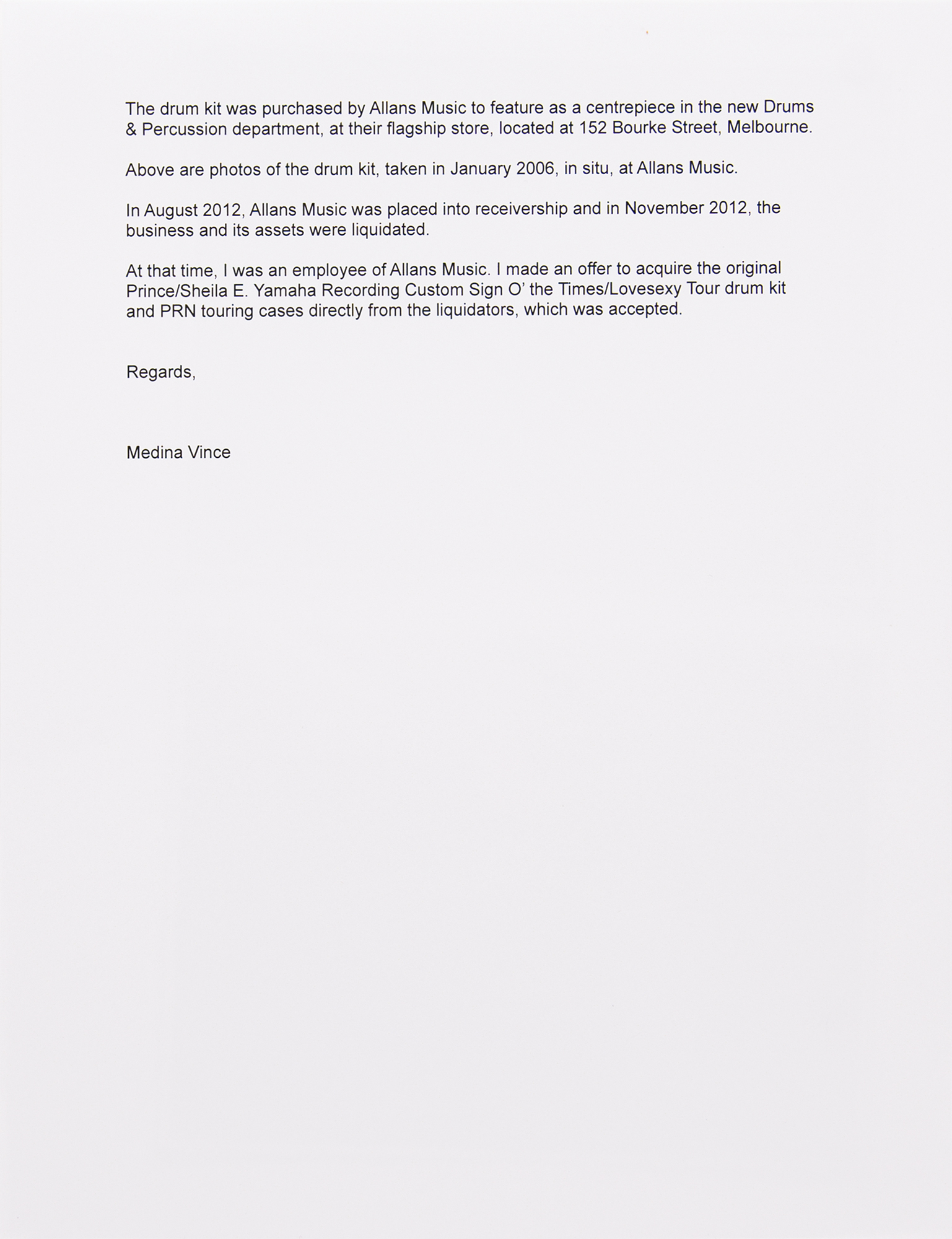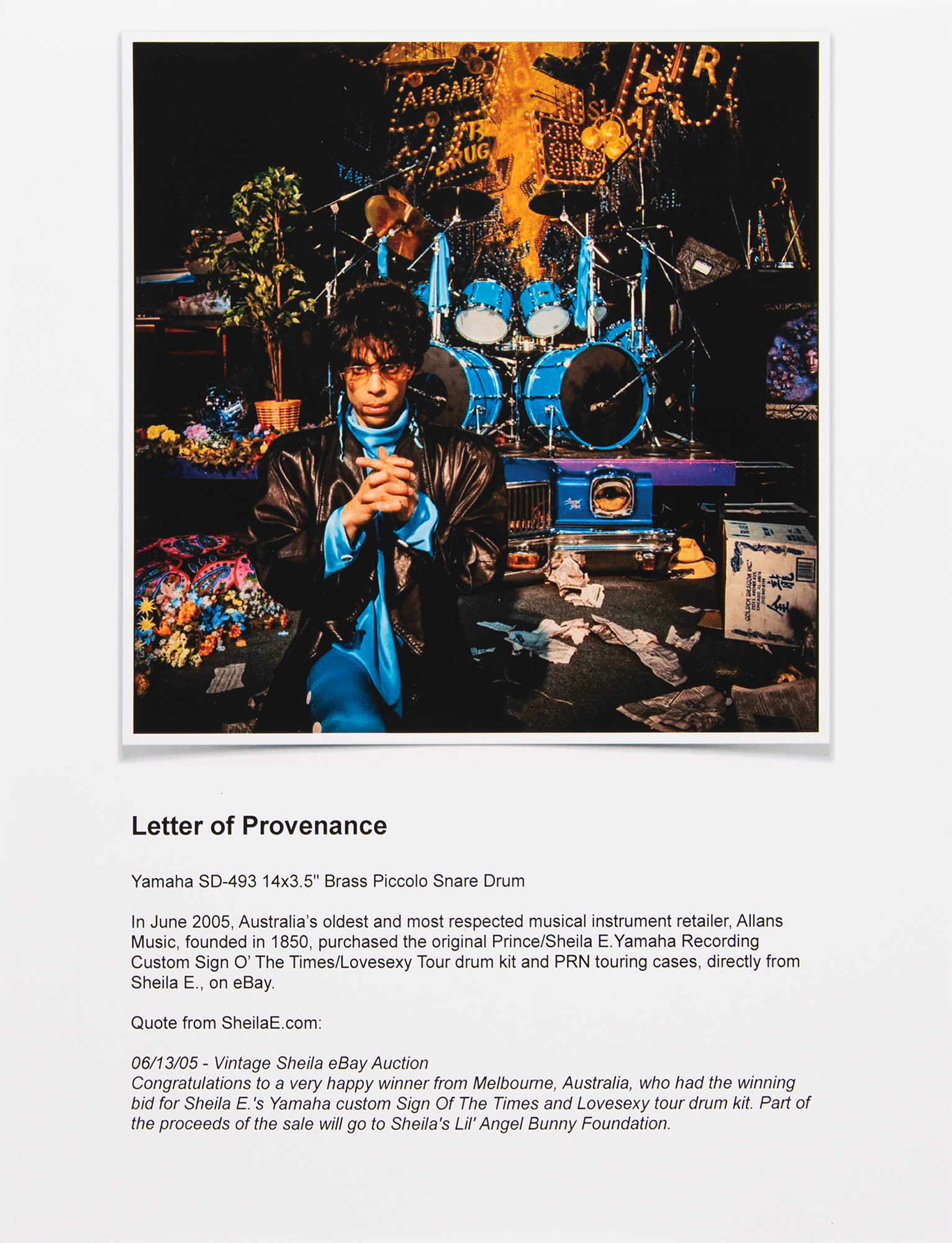 In an eBay auction held in 2005, Sheila E. sold her custom drum kit that she used during Prince’s Sign o' the Times and Lovesexy Tours to noted Australian music retailer Allans Music, which featured the kit—and this offered snare drum—as a centerpiece in the new ‘Drums and Percussion’ department at their flagship store located at 152 Bourke Street in Melbourne. Photos of the kit taken at Allans Music in January 2006 are included, as is a letter of provenance from the drum kit’s former owner: “In August 2012, Allans Music was placed into receivership and in November 2012, the business and its assets were liquidated. At that time, I was an employee of Allans Music. I made an offer to acquire the original Prince/Sheila E. Yamaha Recording Custom Sign O' the Times/Lovesexy Tour drum kit…directly from the liquidators, which was accepted.”