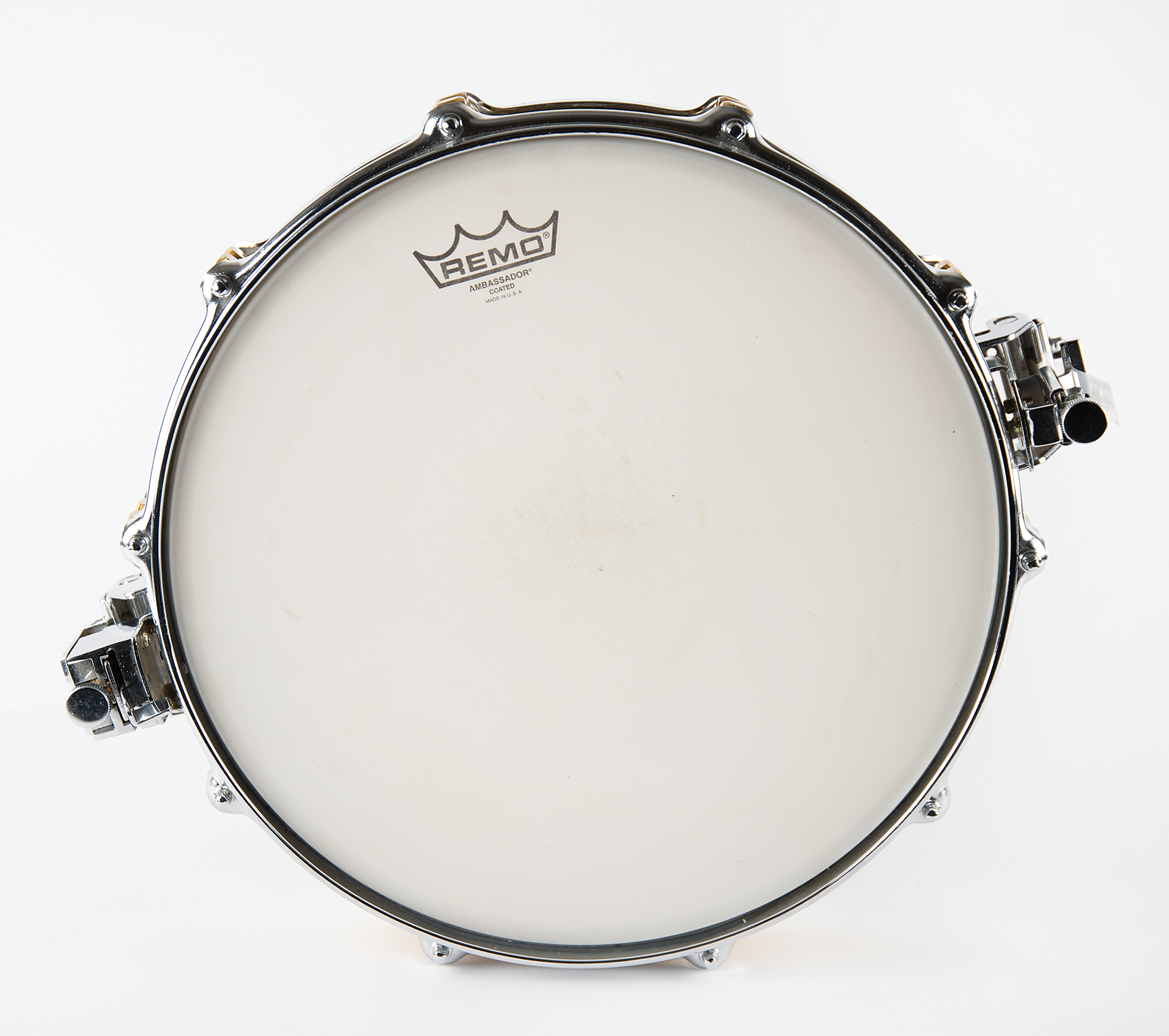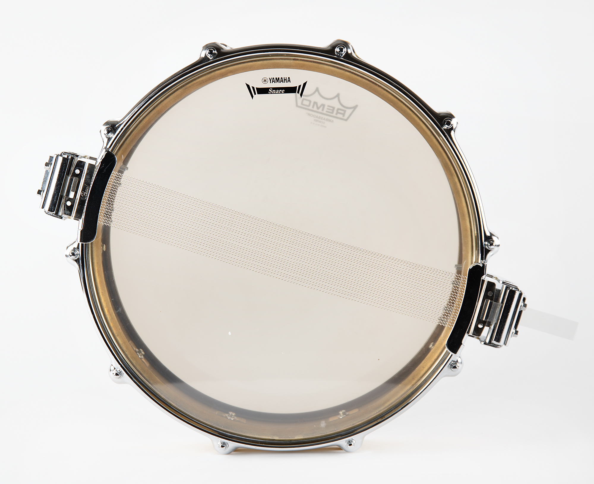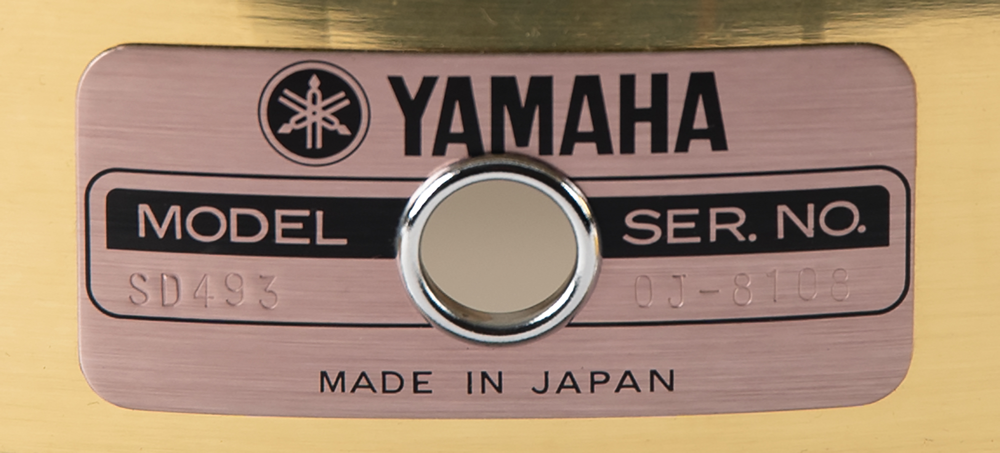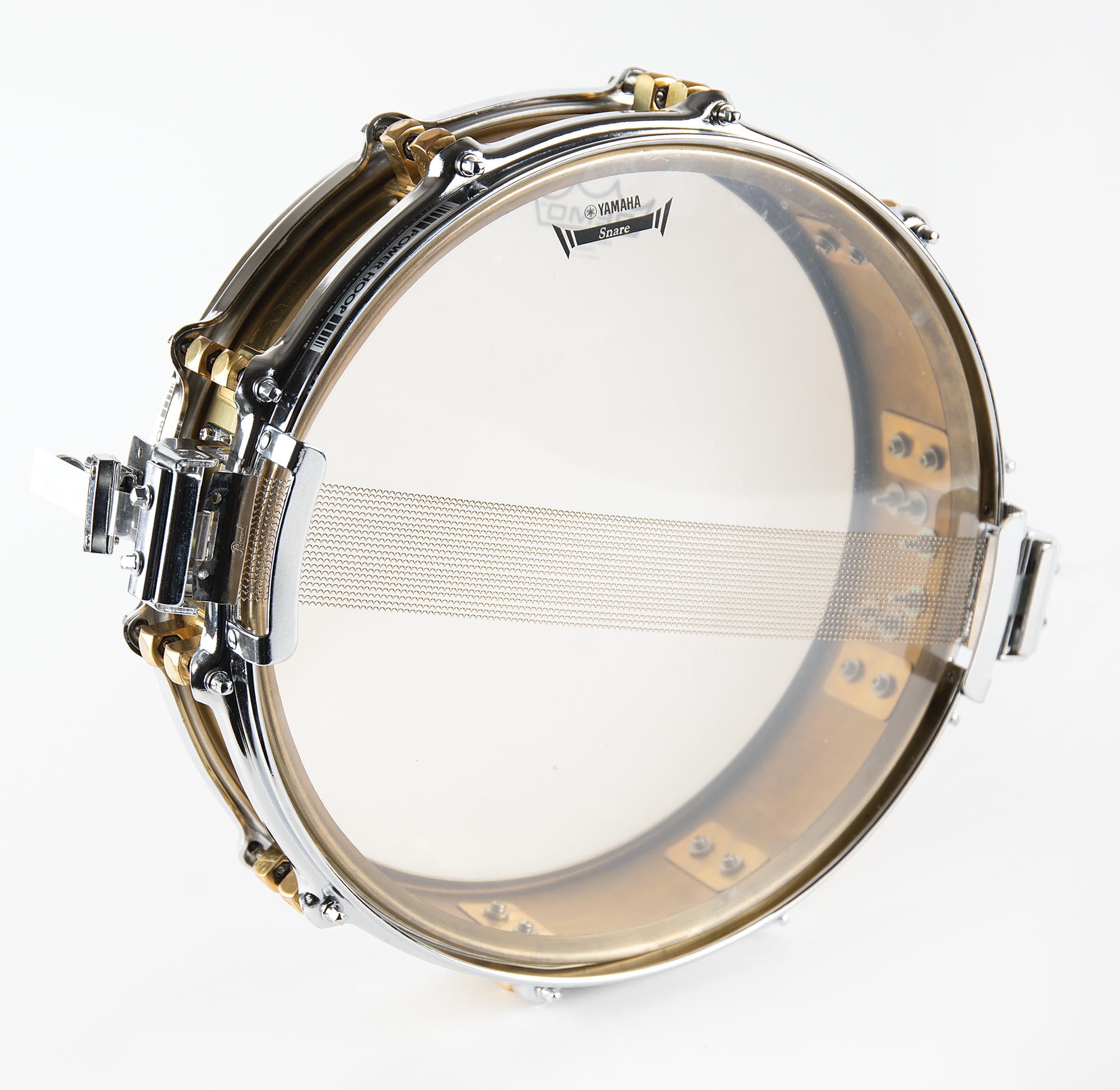 Stage-used custom ‘golden’ snare drum, 14˝ x 3.5˝, used by both Sheila E. and Prince throughout their back-to-back Sign o' the Times and Lovesexy Tours of 1987 and 1988, consisting of 14.5˝ Yamaha Power Hoops and a coated off-white Remp Ambassador drumhead, with the golden shell bearing a Yamaha parts label that reads: “Model SD493, Ser. No., OJ-8108.” In fine condition, with expected light wear.