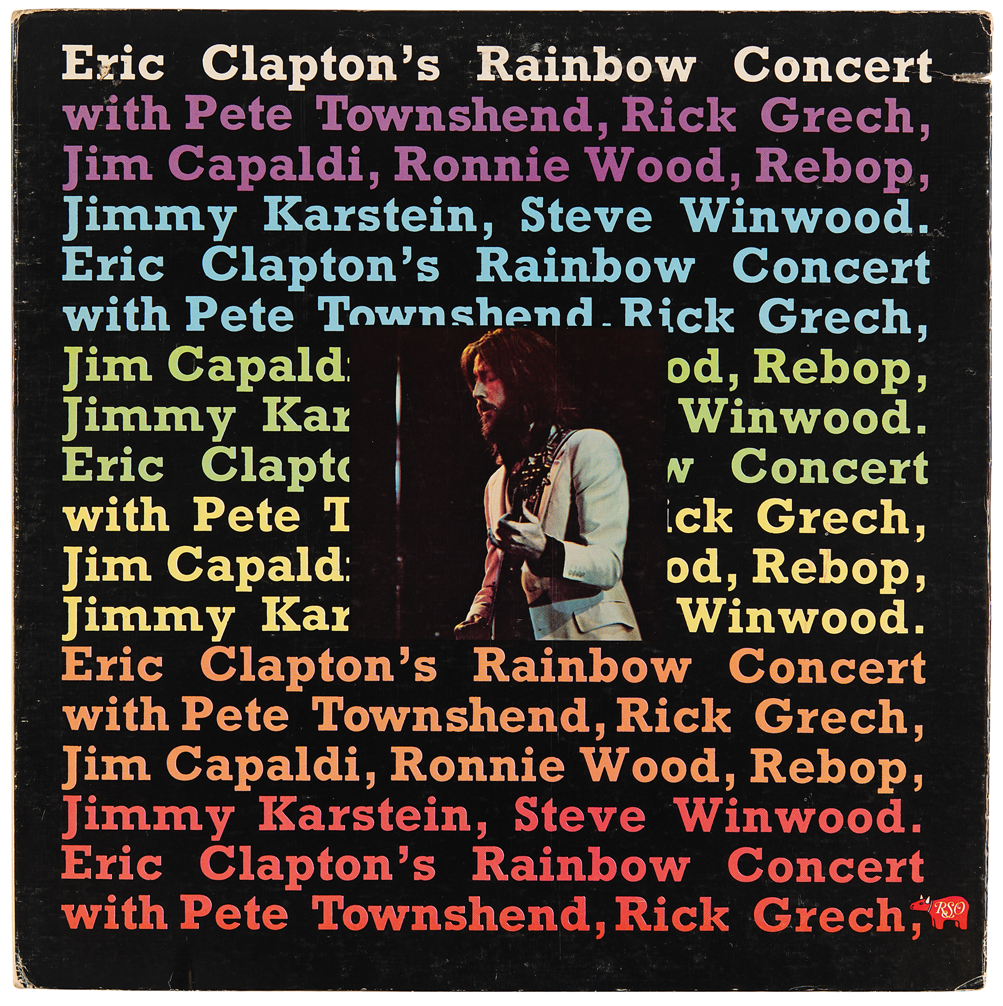 Eric Clapton's Rainbow Concert album, signed on the inner gatefold in blue felt tip by Clapton. In fine condition, with a discount price cut to the right edge. The record is included.