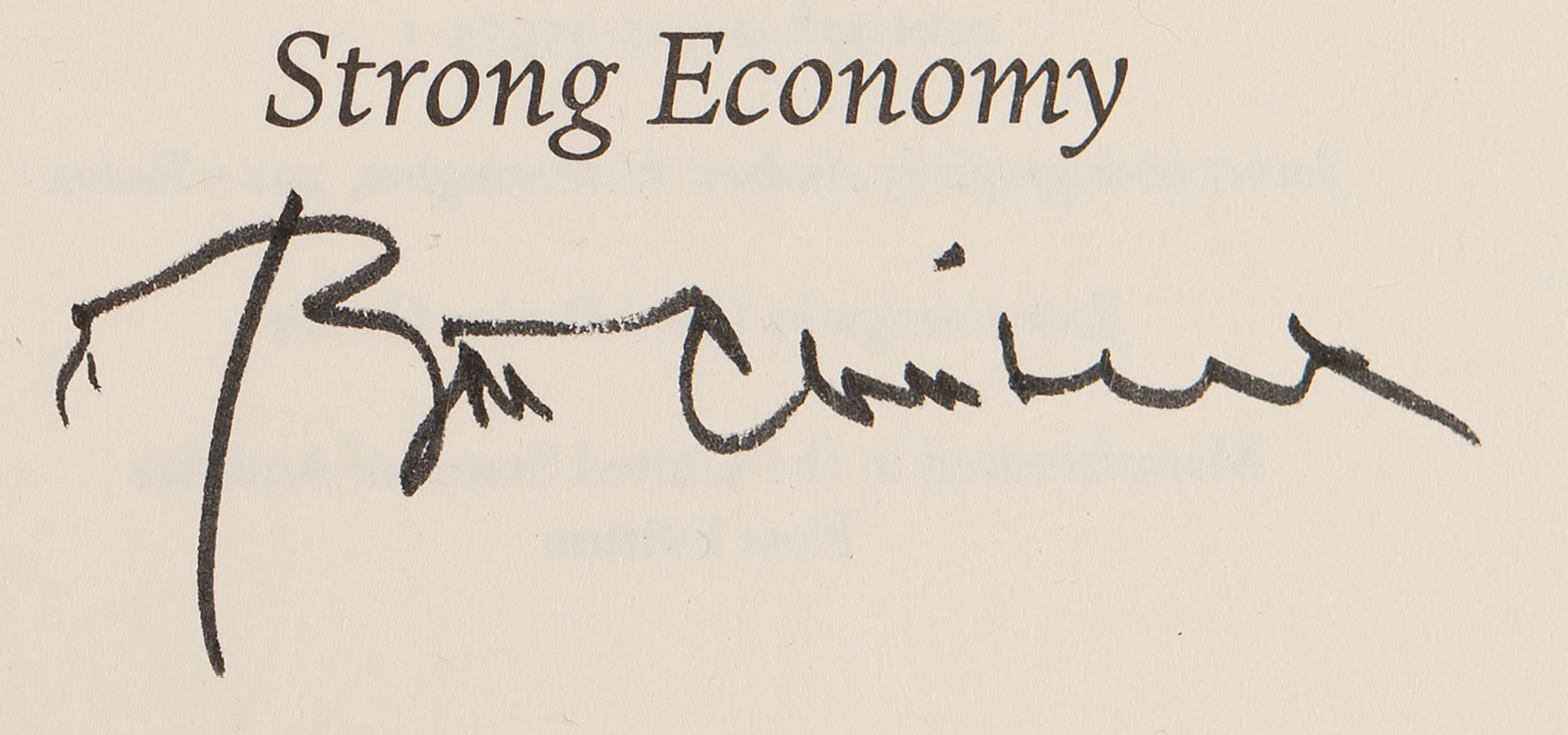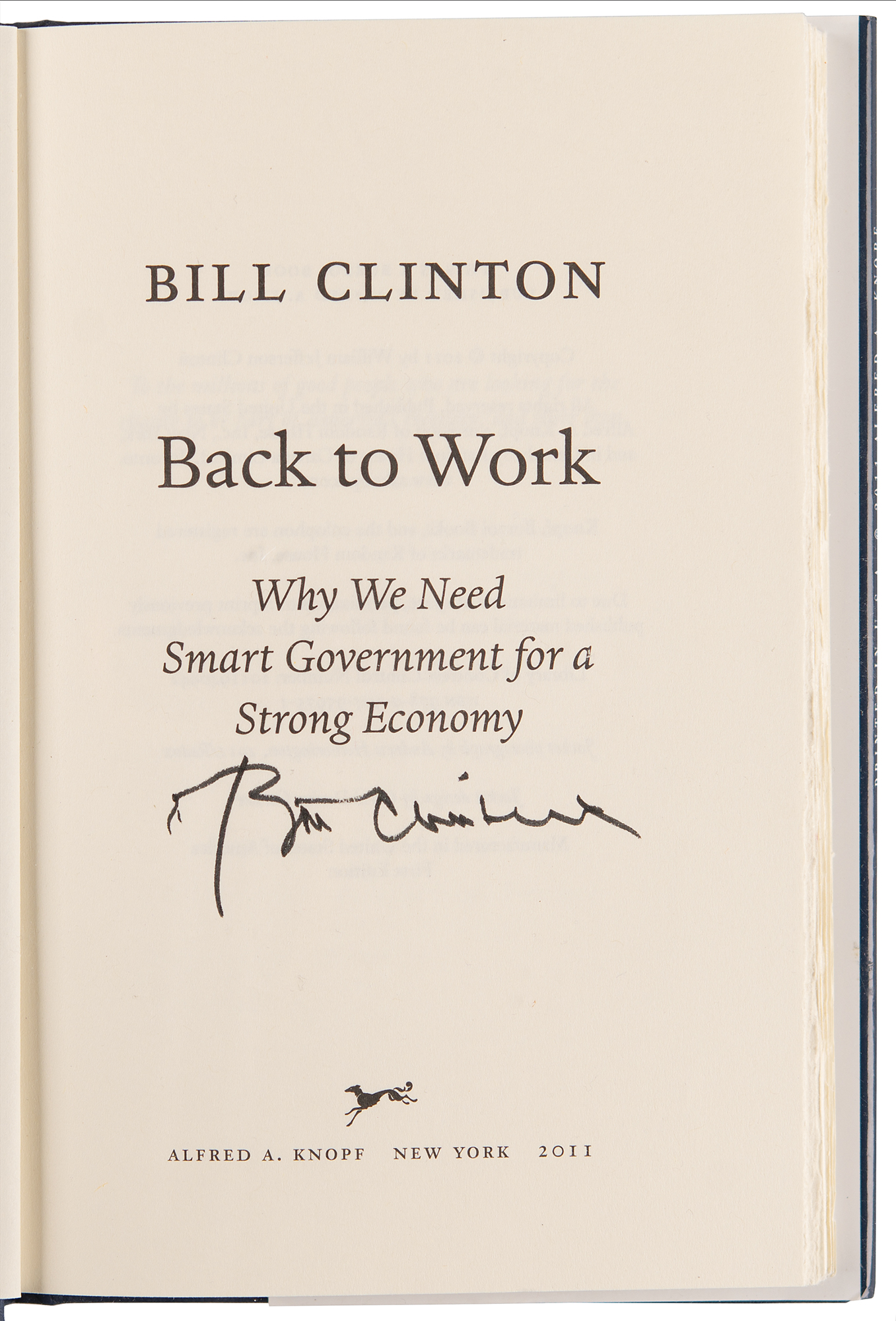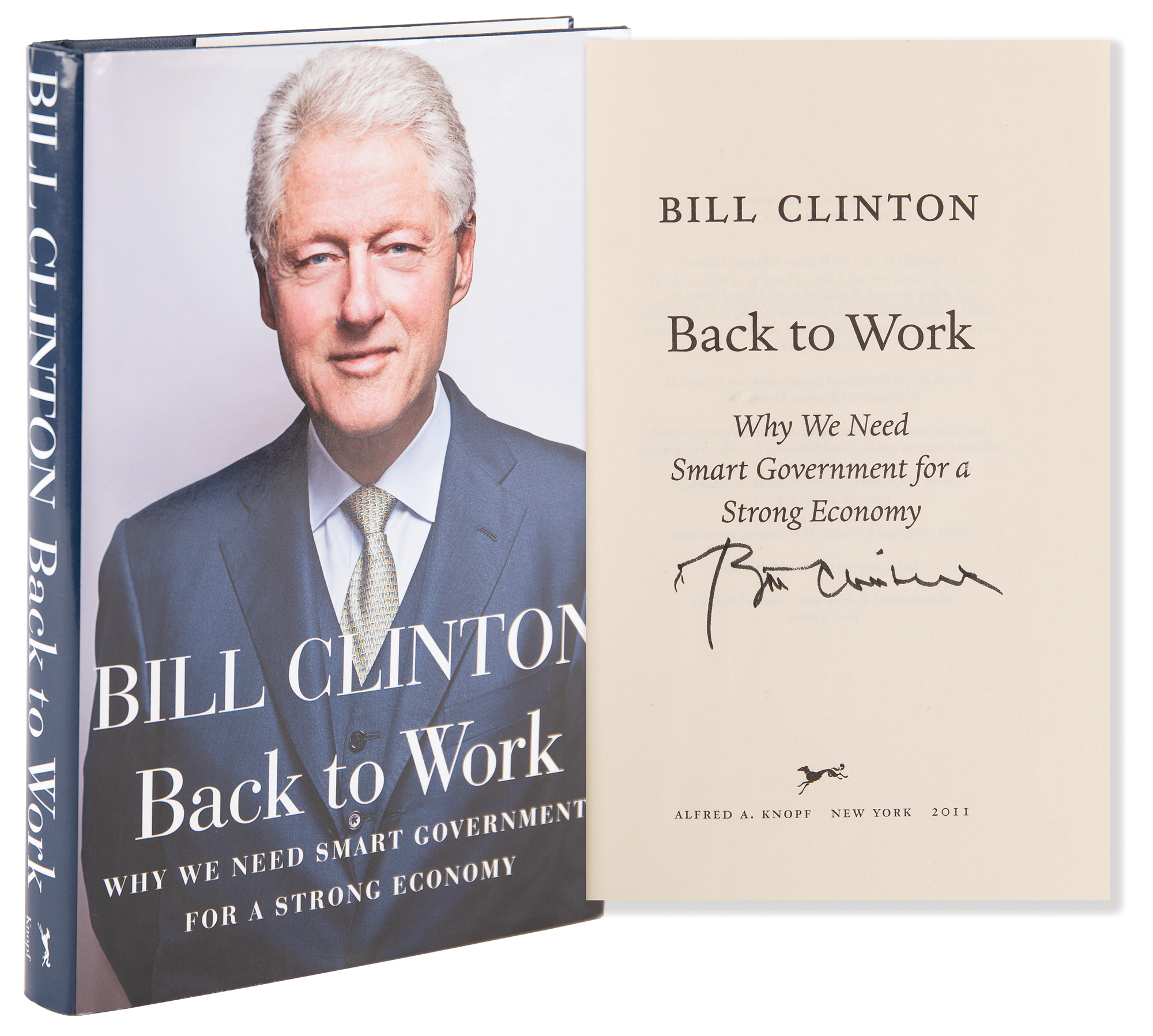 Signed book: Back to Work. First edition. NY: Alfred A. Knopf, 2011. Hardcover with dust jacket, 6 x 8.75, 196 pages. Signed on the title page in black felt tip by Bill Clinton. In very fine condition.