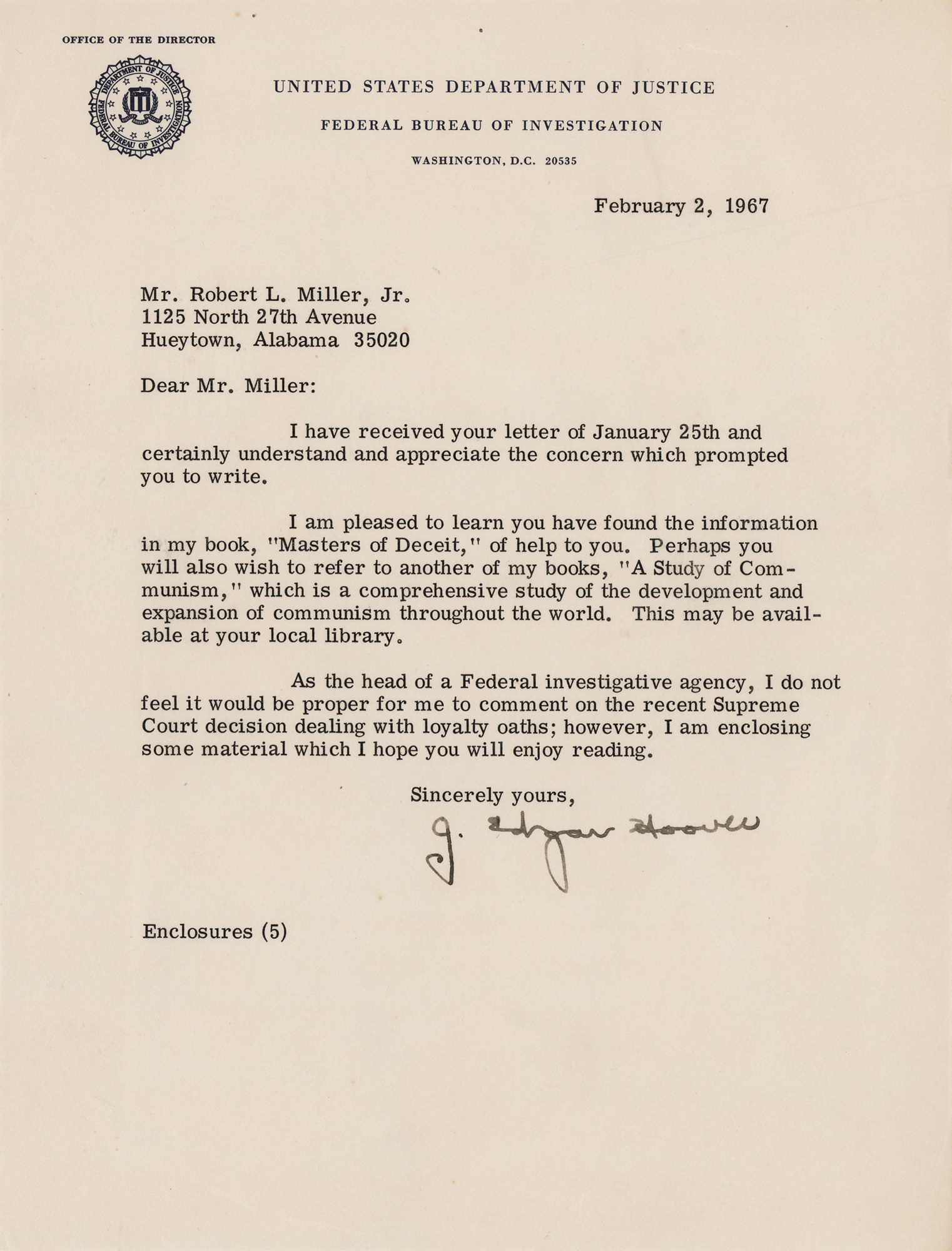 TLS, one page, 8 x 10.5, Federal Bureau of Investigation letterhead, February 2, 1967. Letter to Robert L. Miller, Jr., of Hueytown, Alabama, in part: "I am pleased to learn that you have found the information in my book, 'Masters of Deceit,' of help to you. Perhaps you will also wish to refer to another of my books, 'A Study of Communism,' which is a comprehensive study of the development and expansion of communism throughout the world. This may be available at your local library. As the head of the Federal investigative agency, I do not feel it would be proper for me to comment on the recent Supreme Court decision dealing with loyalty oaths." In fine condition, with light scattered creasing.