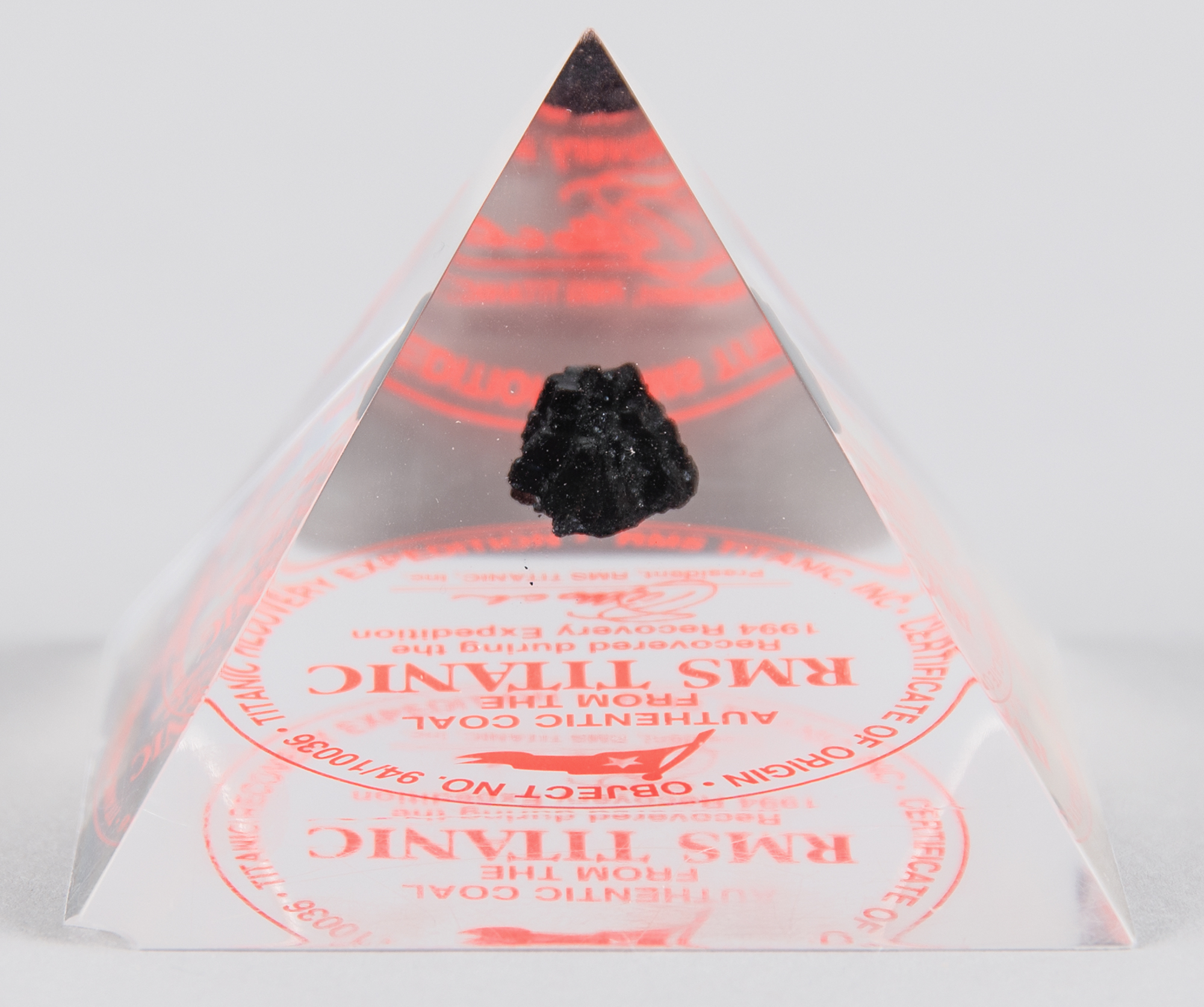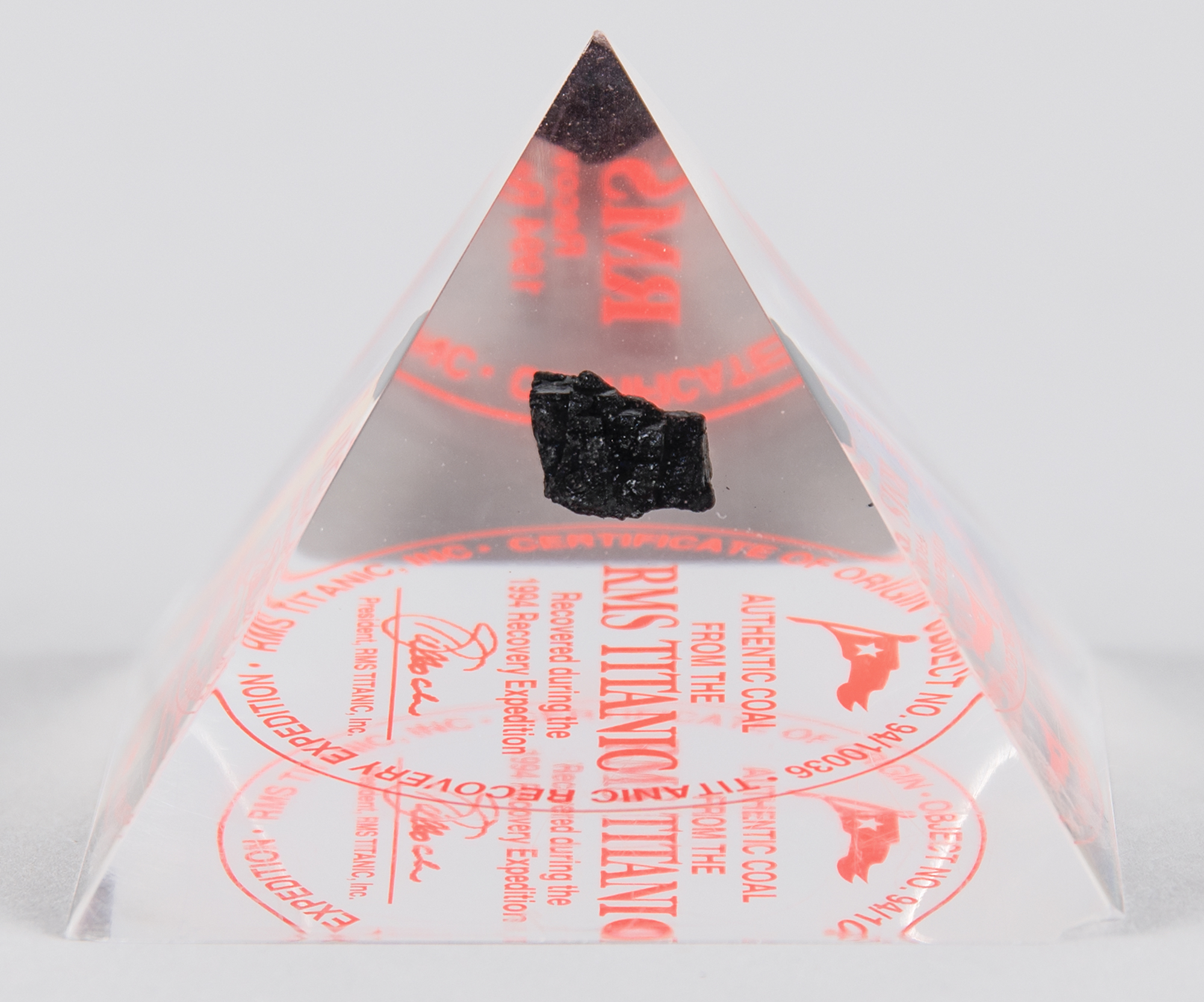 Small piece of coal recovered from the wreck of the RMS Titanic, which lies at a depth of roughly 12,500 feet, about 370 nautical miles south-southeast off the coast of Newfoundland in the Northern Atlantic Ocean. The coal piece measures about 12 mm x 5 mm x 8 mm, and encased in an acrylic pyramid above the certification seal of RMS Titanic, Inc., which carried out the 1994 Titanic Recovery Expedition. In fine condition, with a chip to one corner of the pyramid's base.
