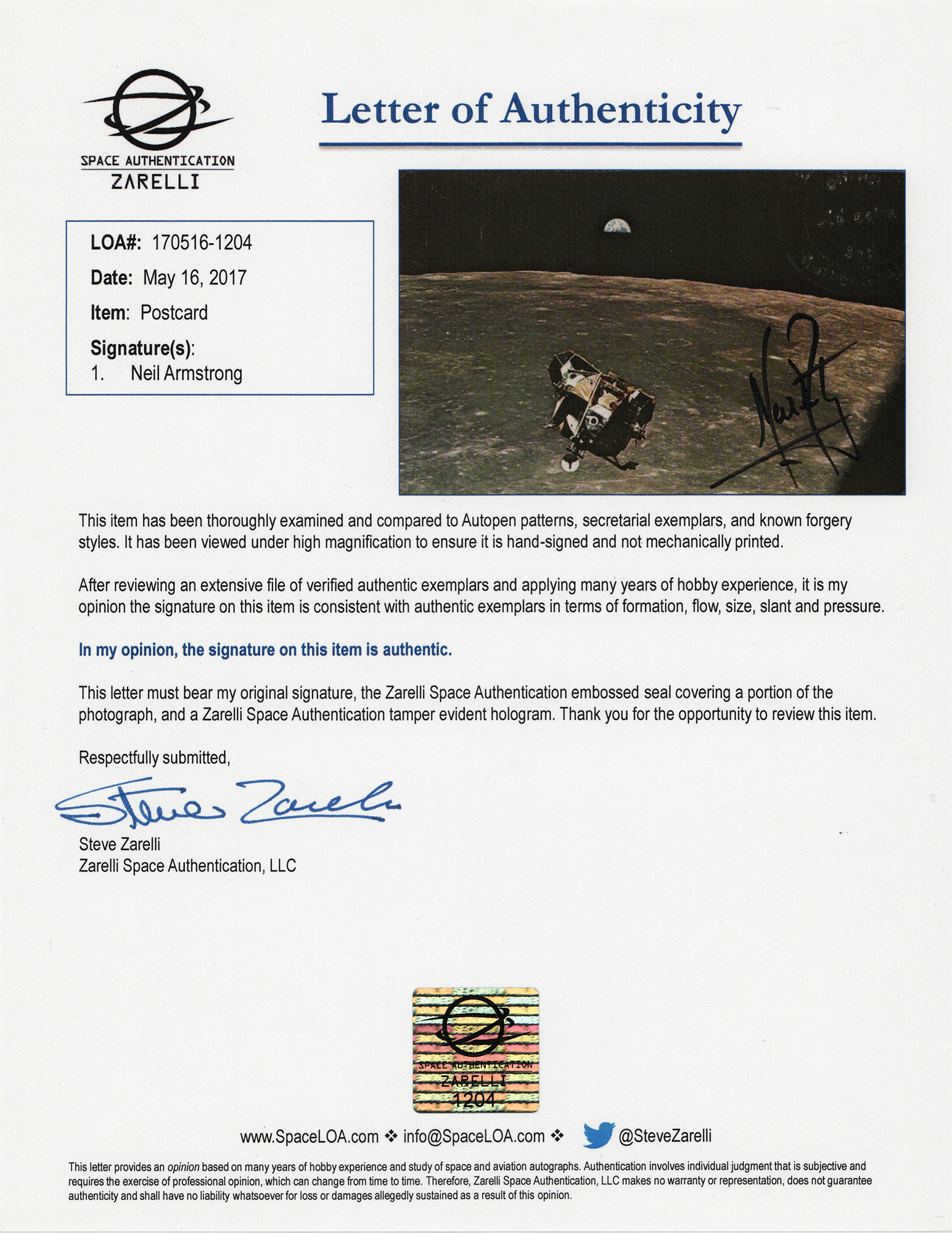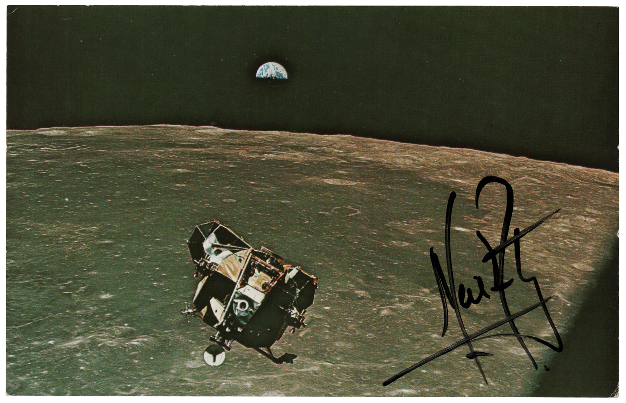 Scarce color 5.5 x 3.5 postcard photo of the Apollo 11 Lunar Module Eagle's ascent from the lunar surface, signed in black felt tip, "Neil Armstrong." In fine condition. Accompanied by a full letter of authenticity from Zarelli Space Authentication. An uncommon and historic image signed by mankind's first moonwalker.