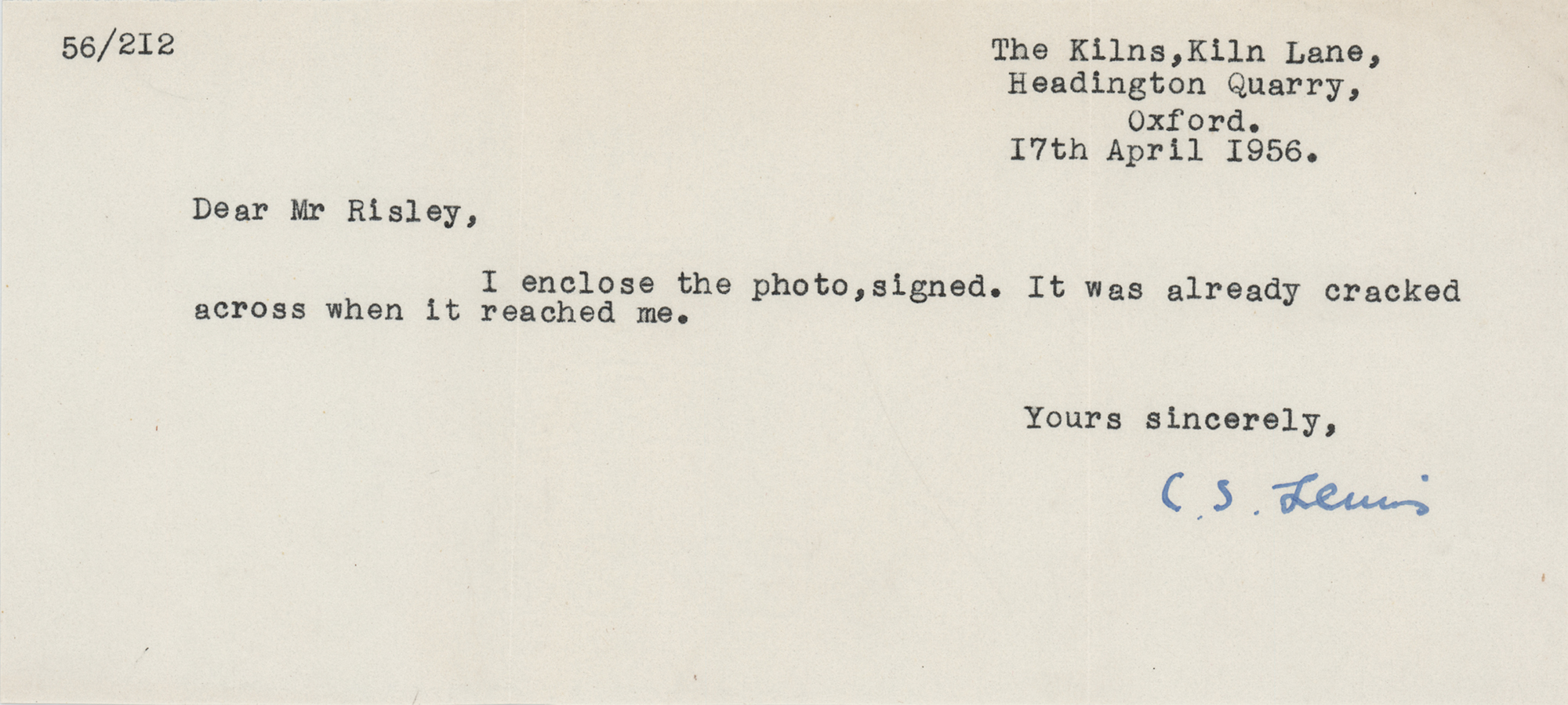 Influential Irish author and scholar (1898-1963), a former atheist who became an eloquent convert to Christianity, best known for his works on Christian theology and his much-beloved, seven-book juvenile fantasy series The Chronicles of Narnia. TLS, one page, 8 x 3.5, April 17, 1956. Letter to "Mr. Risley," in full: "I enclose the photo, signed. It was already cracked across when it reached me." In fine condition.