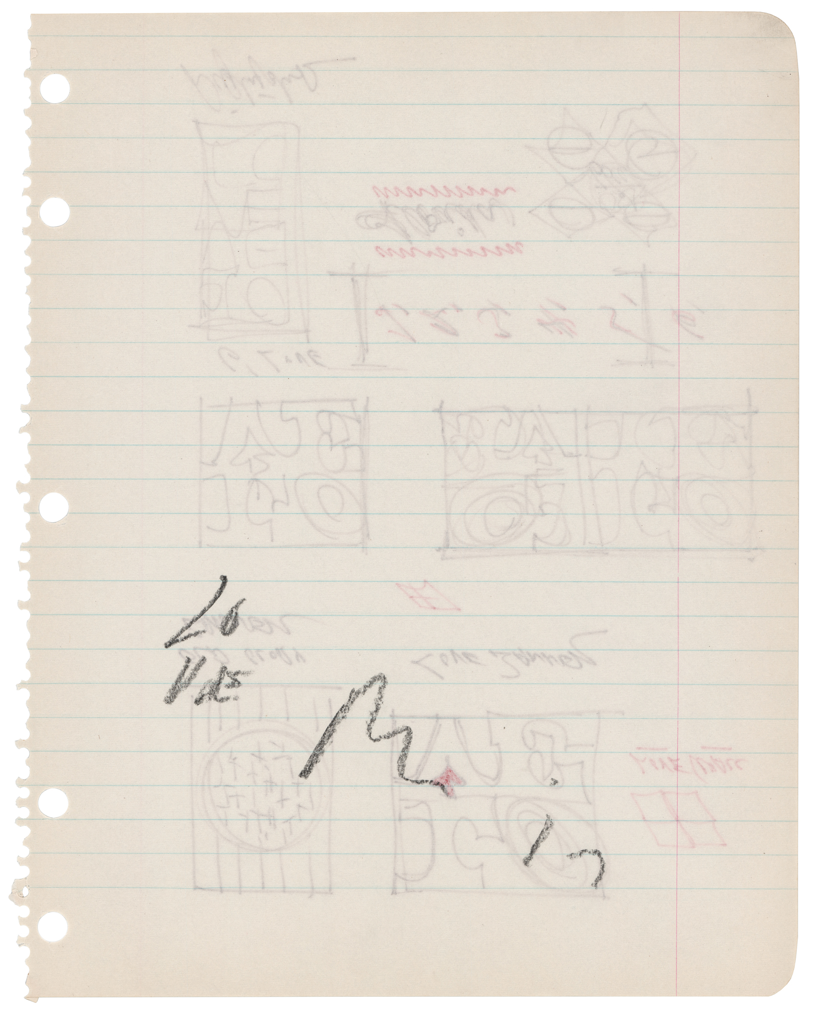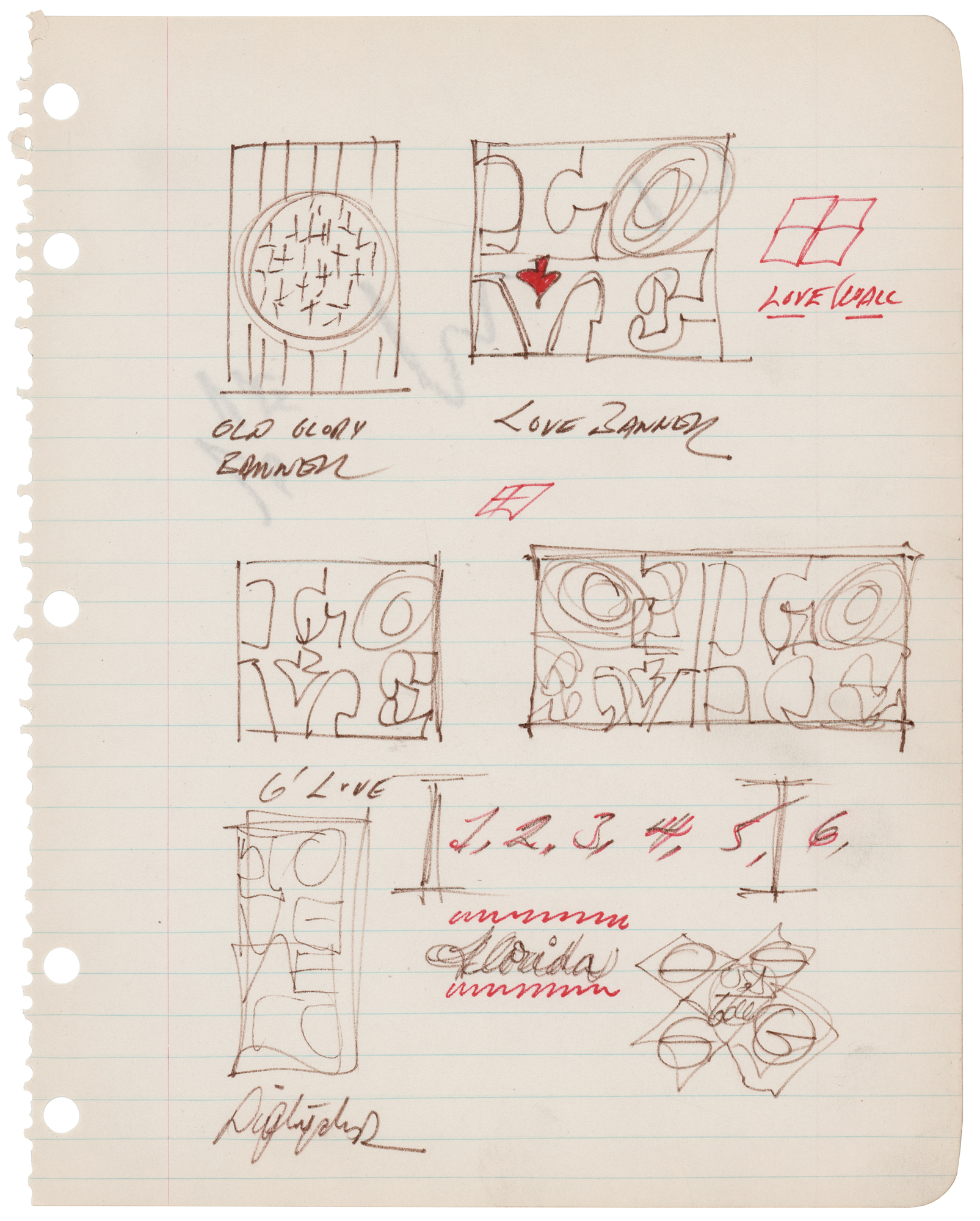 Original working sketch by Robert Indiana of a draft for artwork incorporating his iconic "LOVE" design, accomplished in brown and red felt tip on an off-white lined 7.75 x 10 sheet, signed on the reverse in pencil, "R. in.," adding "LOVE." At the top, Indiana sketches a a flag-themed "Old Glory Banner" and a "Love Banner," which uses his famed double-row "LOVE" design with a slanted "O." In the center row, Indiana draws two three examples of the double-row "LOVE" design, one as a mirror image. Below, he continues the theme with another "LOVE" concept in a slightly different format. In fine condition.