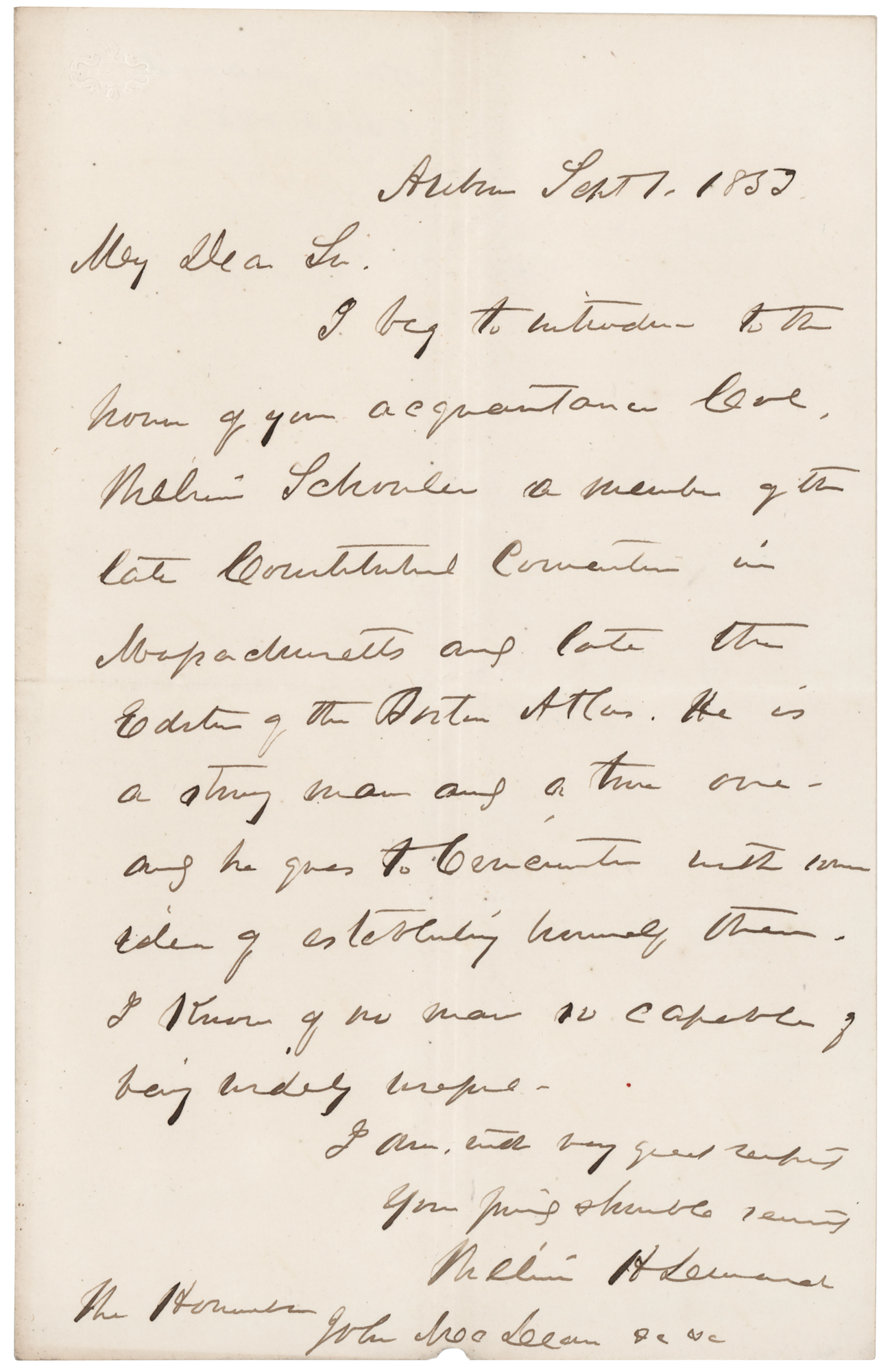 American statesman (1801–1872) who served as secretary of state in the administration of President Abraham Lincoln and who was severely injured in an attack that was part of the assassination conspiracy. His greatest political achievement was the purchase of Alaska from Russia, derided by contemporary skeptics as 'Seward's Folly.' ALS, one page, 5 x 8, September 1, 1853. Handwritten letter to Supreme Court Associate Justice John McLean, in full: "I beg to introduce to the honor of your acquaintance Col. William Schouler, a member of the late Constitution Convention in Massachusetts and the late Editor of the Boston Atlas. He is a strong man and a true one—and he goes to Cincinnati with some idea of establishing himself there. I know of no man so capable of being widely useful." In fine condition.