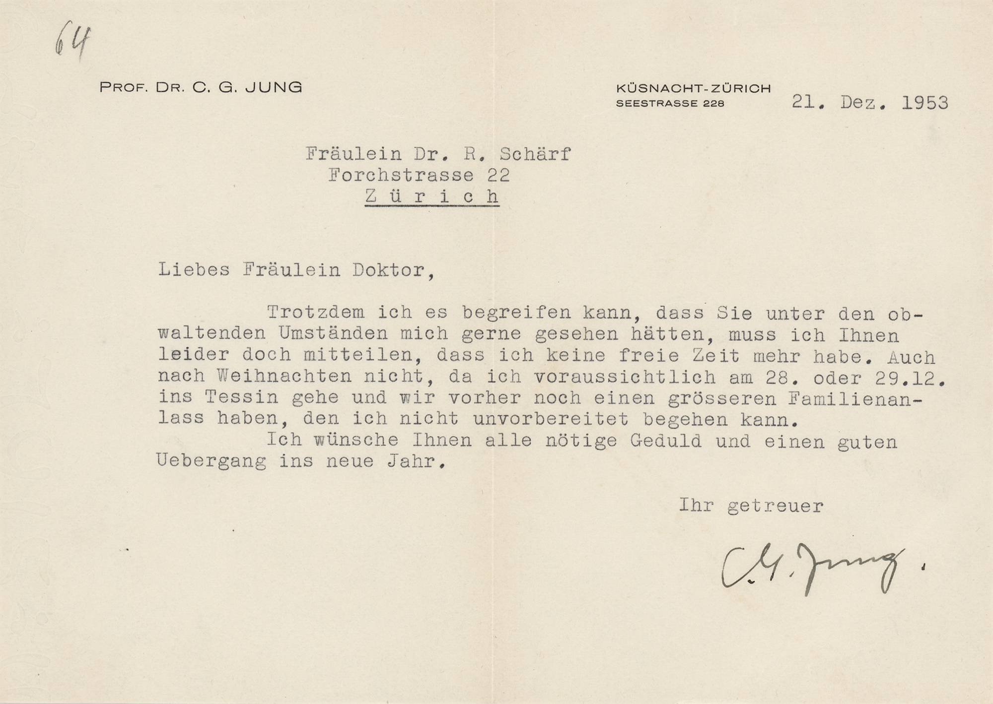 TLS in German, signed “C. G. Jung,” one page, 8.25 x 5.75, December 21, 1953. Letter to "Fraulein Dr. R. Scharf," in full (translated): "Although I can understand that you would have liked to see me under the current circumstances, I unfortunately have to tell you that I have no free time left. Not even after Christmas, as I am probably going to Ticino on December 28th or 29th and we have a major family event beforehand that I cannot attend unprepared. I wish you all the patience you need and a smooth transition into the new year." In fine condition.
