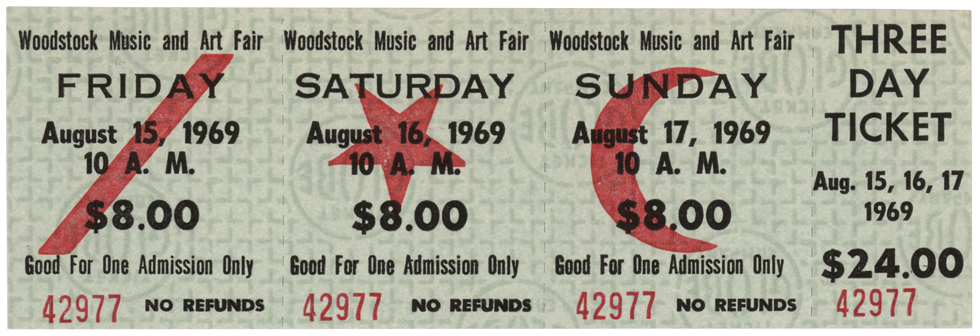 Original unused three-day admission ticket for the iconic Woodstock Music and Art Fair, 6 x 2, issued for August 15-17, 1969, numbered "42977." This ticket was sold at the gate for $24; advance tickets were purchased for $18. In very fine condition.