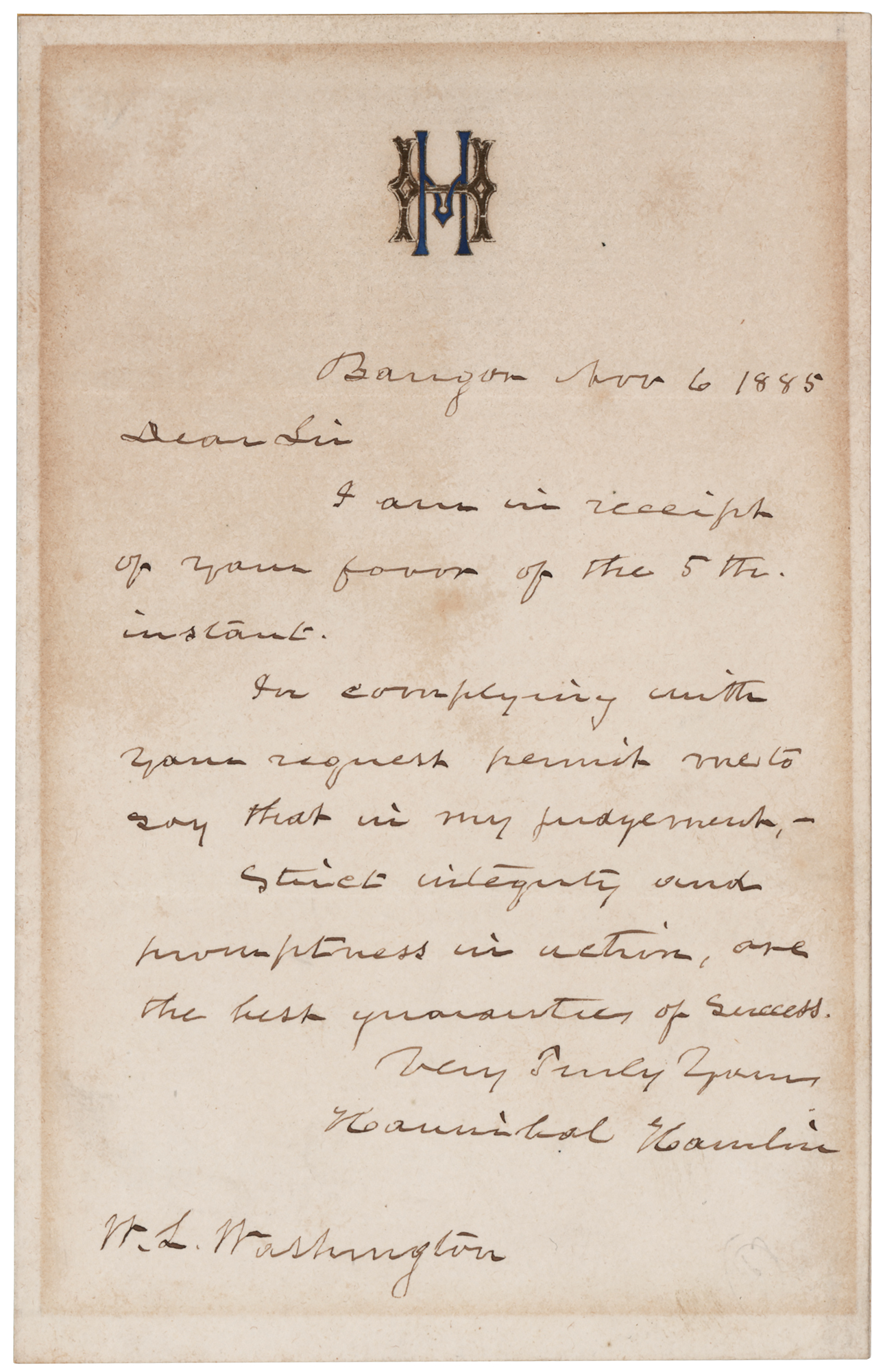 American attorney and politician (1809–1891) who served as Abraham Lincoln's first vice president. ALS, one page, 4.5 x 7, personal monogrammed letterhead, November 6, 1885. Handwritten letter to W. L. Washington, in part: "In complying with your request permit me to say that in my judgement—strict integrity and promptness in action, are the best guarantees of success." In fine condition, with toning from prior display.