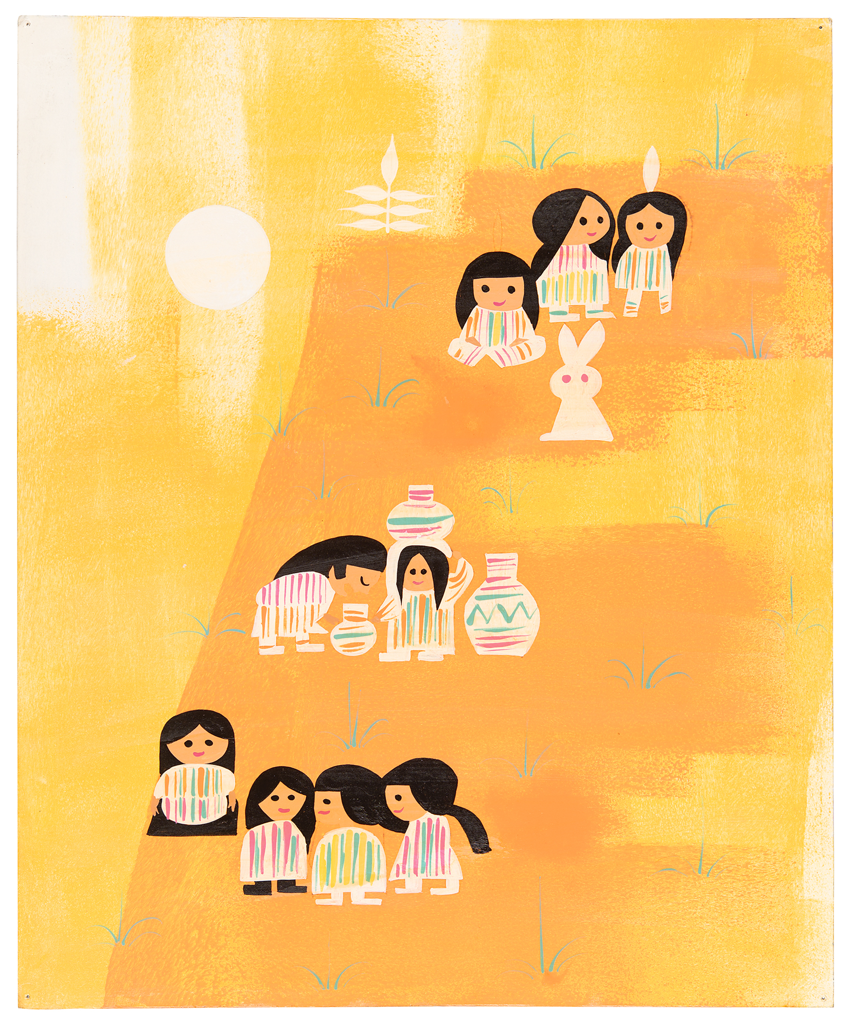 (Walt Disney Studios, circa 1963) Original concept painting by Mary Blair of Native American children for the 'It's a Small World' exhibit and ride created by WED Enterprises for the 1964 New York World's Fair. The brightly colored work shows an orange-and-yellow field with nine children, each dressed in traditional striped clothing, with one group working with pottery and another watching a nearby rabbit. Accomplished in tempera on 14 x 17 artist's board. In fine condition, with tack holes to corners.