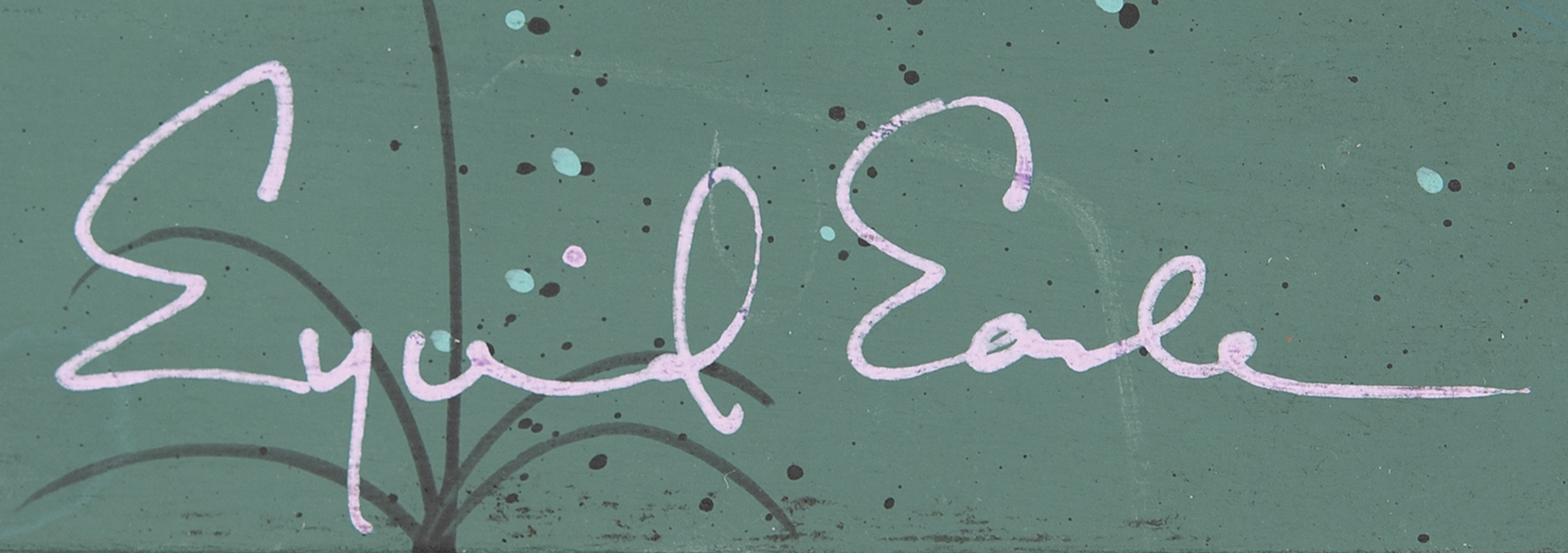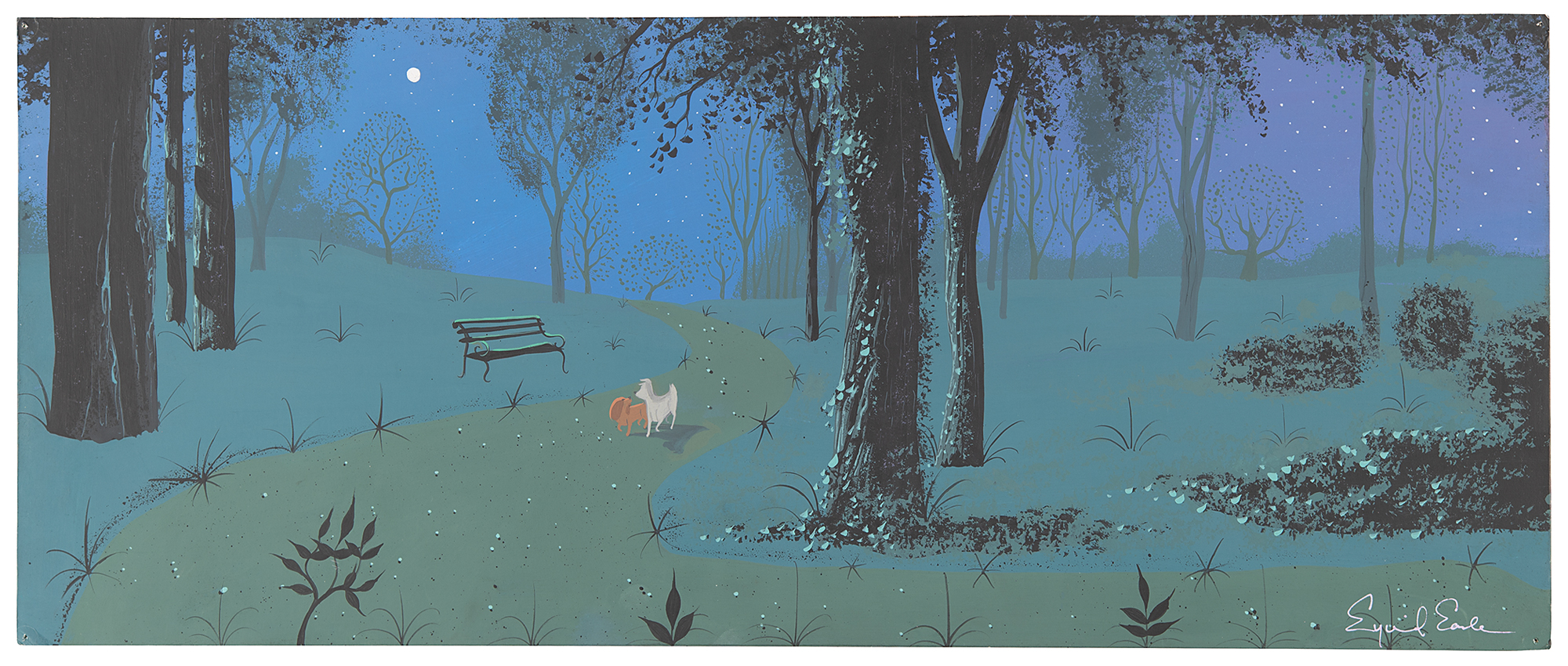 (Walt Disney Studios, 1955) Exquisite original panorama concept painting by Eyvind Earle from Lady and the Tramp, showing the title canines walking on a park path during the iconic 'Bella Notte' sequence. In his distinctive style, Earle captures the nighttime scene with a charming sense of secrecy and isolation, spotlighting the dogs under stars and moonlight to emphasize their growing bond amid a jealous crowd of trees and ferns. Accomplished in tempera on 23.5 x 9.75 artist's board, signed in the lower right corner in pink paint by Earle. In fine condition, with tack holes to corners. Disney artist Eyvind Earle, who later became Sleeping Beauty's production designer, created almost 50 miniature concept sketches for the 'Bella Notte' sequence and was a key contributor to the classic film.