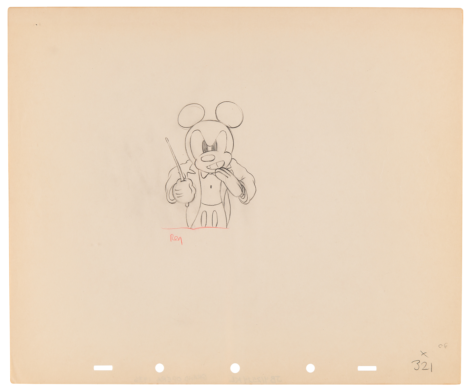 (Walt Disney Studios, 1936) Original production drawing featuring Mickey Mouse from Mickey's Grand Opera, which shows Mickey face-on as the frustrated conductor in a great half-figure pose. Accomplished in graphite and colored pencil on untrimmed 12 x 10 animation paper, marked "321" in the lower right corner. Image measures 2.5 x 3.5. In fine condition.