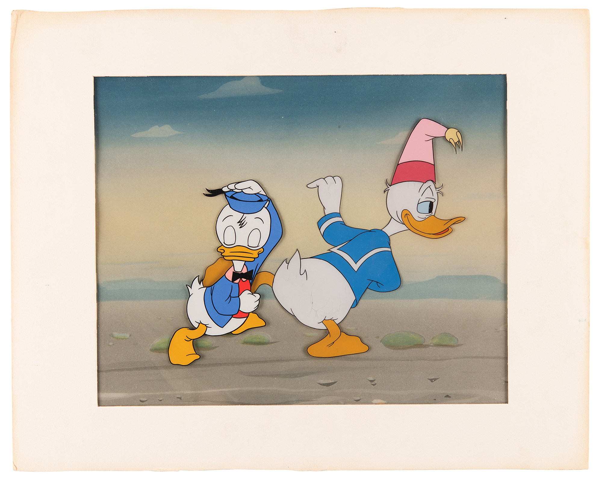 (Walt Disney Studios, 1960) Original production cels featuring Donald Duck and one of his nephews from This is Your Life, Donald Duck, a special installment of the Disneyland TV show. The cels have been trimmed and applied to an airbrushed background. Images measure 3 x 4.25 and 6.5 x 5.75, with a mat opening of 9.75 x 8. Matted to an overall size of 14 x 11. Originally sold at the Art Corner in Disneyland, with the backing featuring an affixed gold Walt Disney Productions label, which reads: "This Is an Original Handpainted Celluloid Drawing Actually Used in a Walt Disney Production." In fine condition.