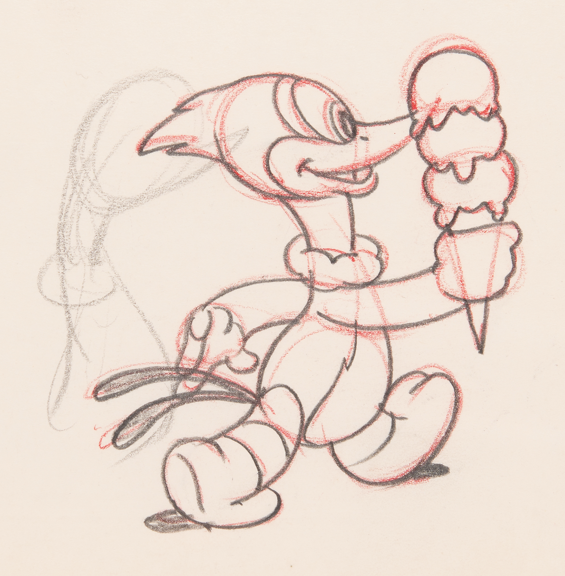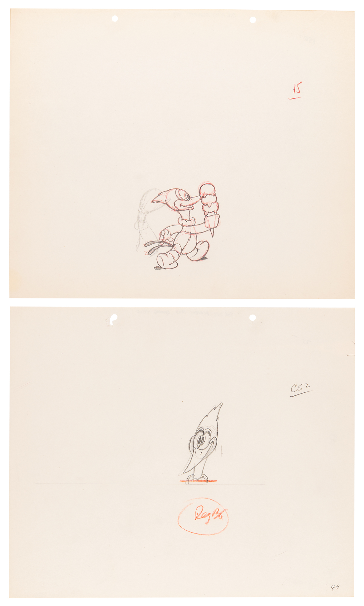 (Walter Lantz Productions, 1943) Two original production drawings featuring Woody Woodpecker from The Dizzy Acrobat, one showing him eating an ice cream cone and the other with a close-up of Woody Woodpecker's face. Accomplished in graphite and colored pencil on untrimmed 12.5 x 10.5 animation paper. Images measure 2.75 x 3 and 1.25 x 3. In fine condition.