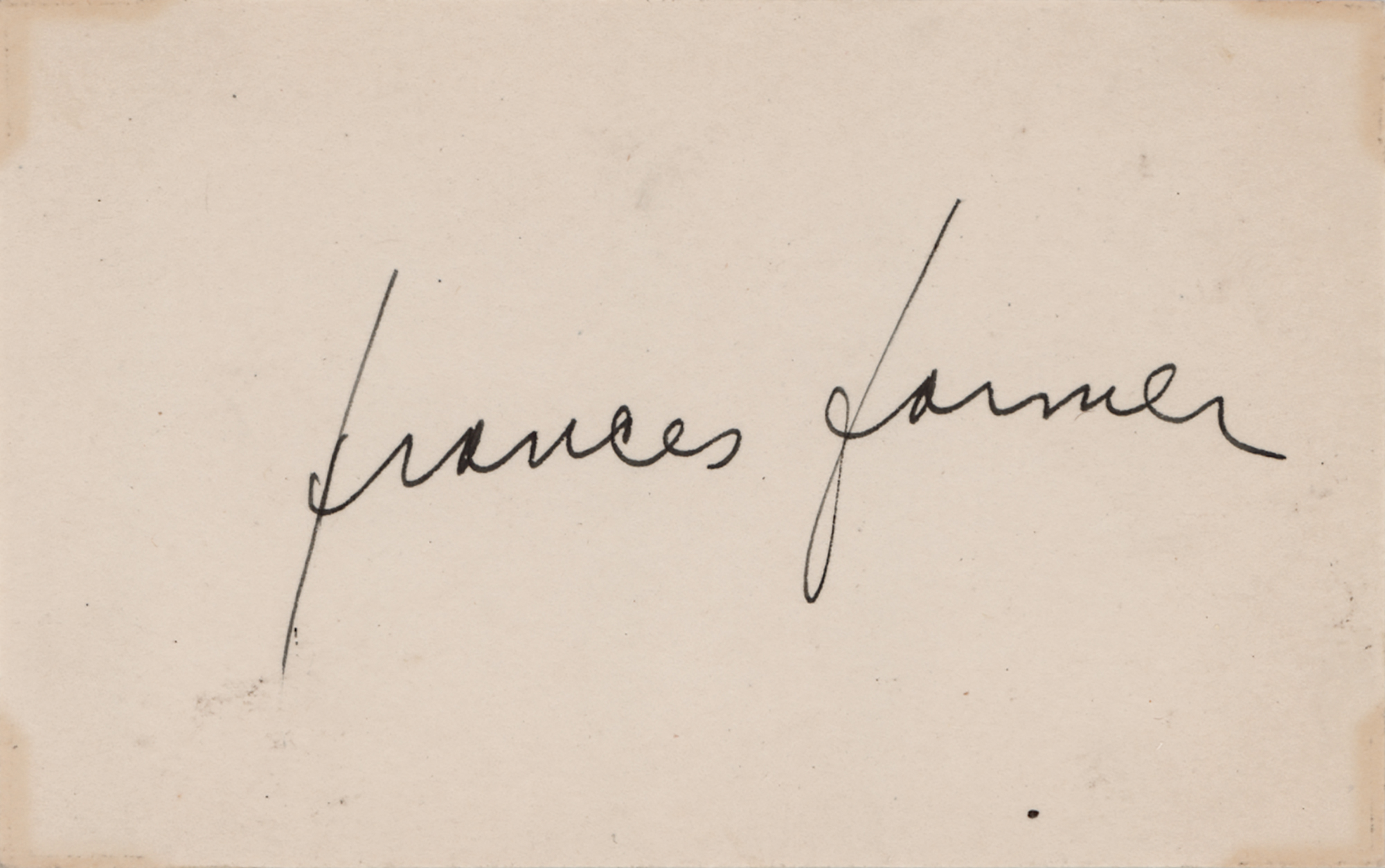 Promising American actress (1913–1970) whose career was cut short by alcoholism. She retired from films in 1942 and spent a large part of the remainder of her life in mental institutions, dying of cancer at 57. Vintage fountain pen signature, "Frances Farmer,” on an off-white 4 x 2.5 slip. In fine condition.