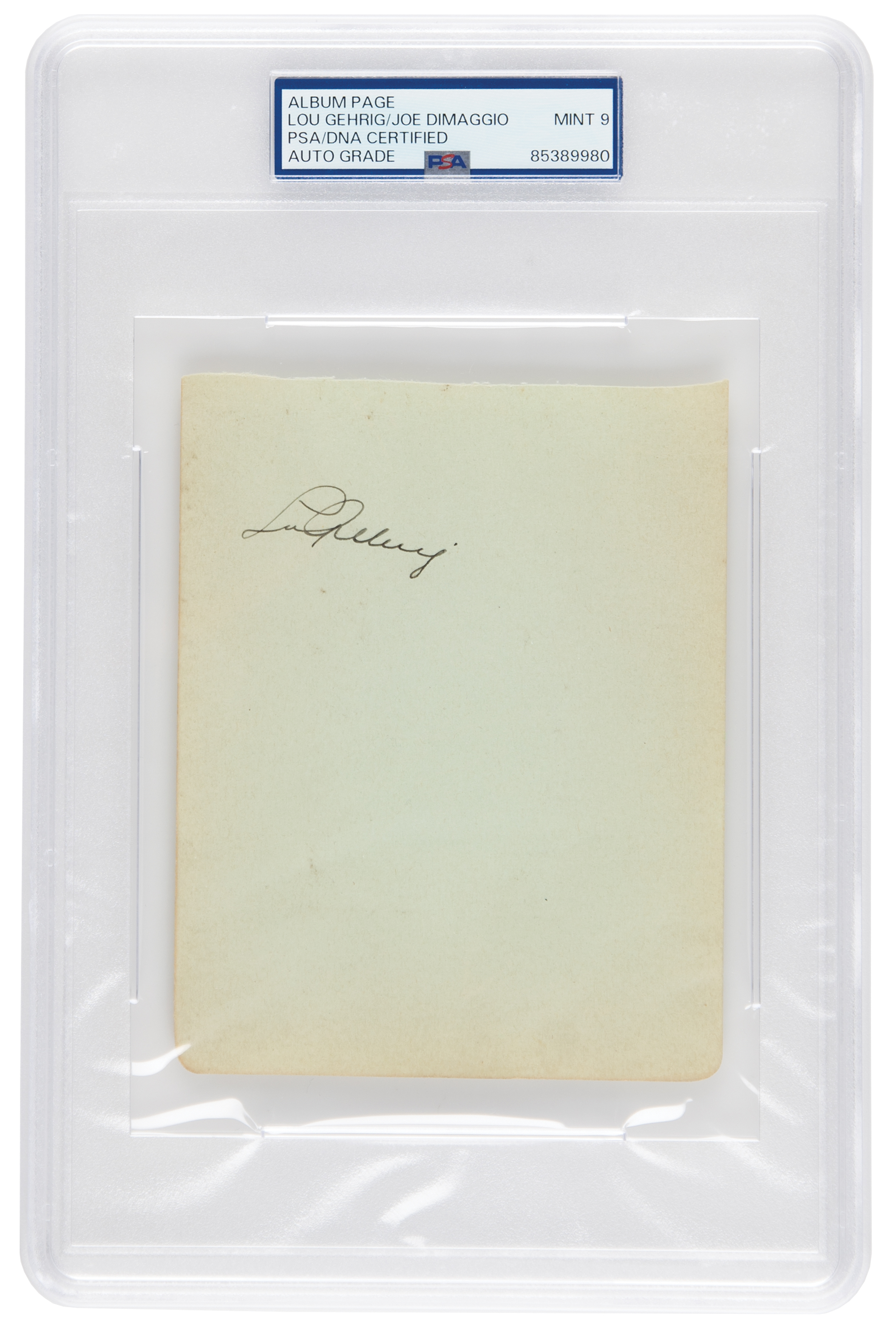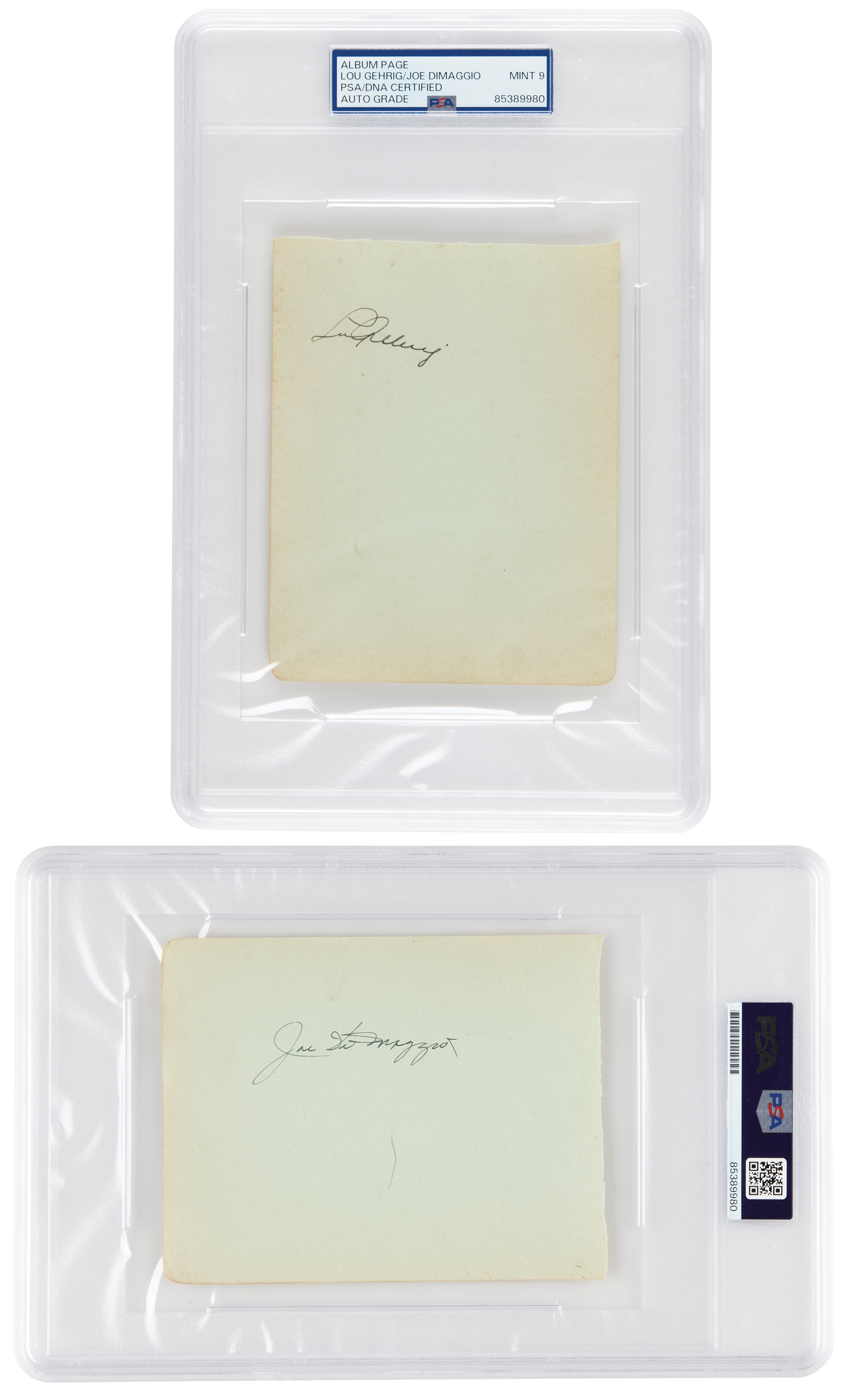 Vintage fountain pen signatures, "Lou Gehrig" and "Joe DiMaggio,” on opposite sides of a pale green 5.5 x 4.25 album page. In fine condition. With the careers of Lou Gehrig and Joe DiMaggio overlapping from 1936 to 1939, this remarkable autograph page represents a passing of the torch from one Yankees icon to another. Gehrig had cemented his status as baseball's sturdy 'Iron Horse,' and DiMaggio was emerging as the superstar anchor of the Yankees' outfield. To have ideal autographs of two of New York's all-time greats on a single item is incredibly desirable. Encapsulated and graded by PSA/DNA as “MINT 9.”