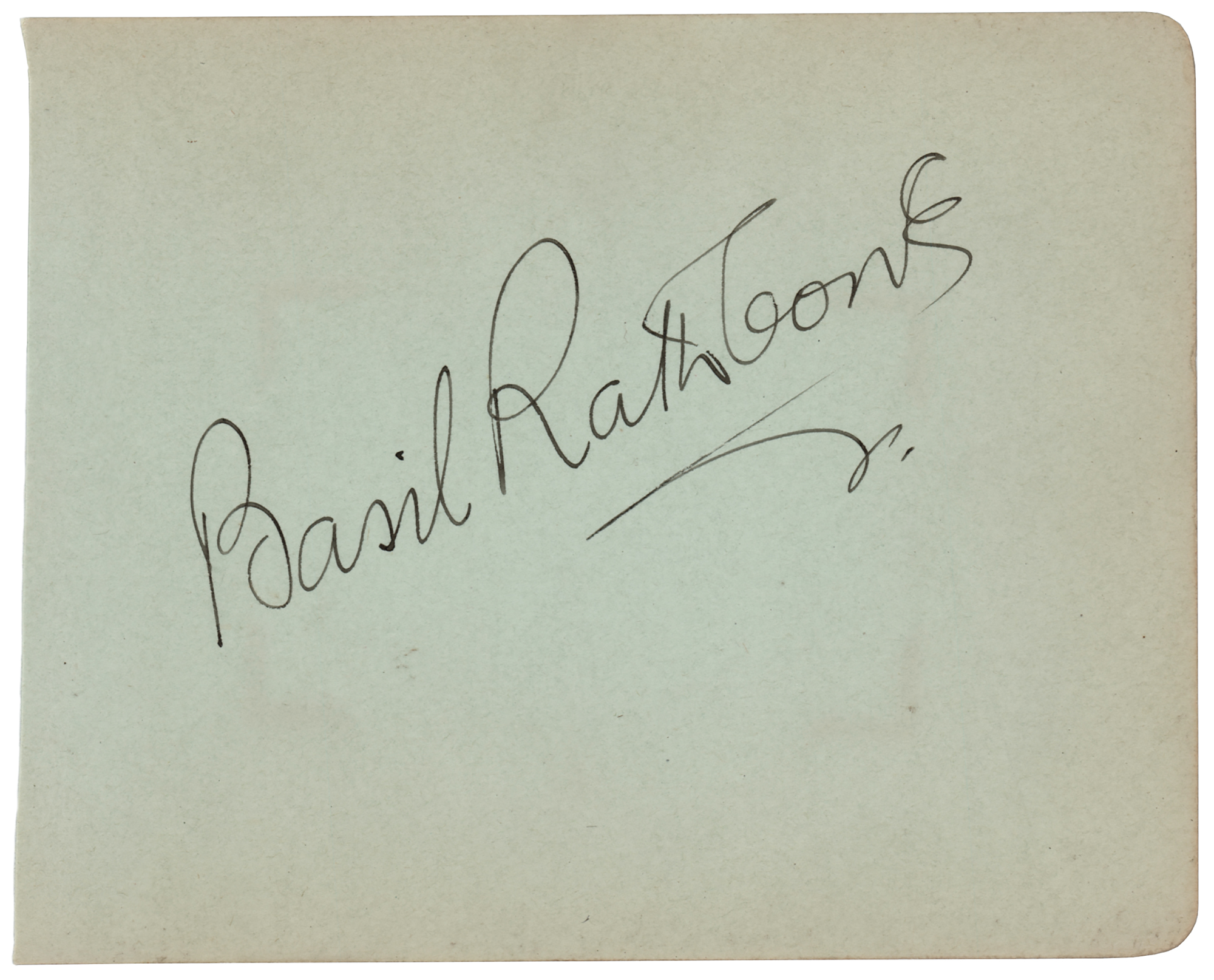 Large and bold vintage fountain pen signature, "Basil Rathbone,” on a light green 5.25 x 4.25 album page. In fine condition.