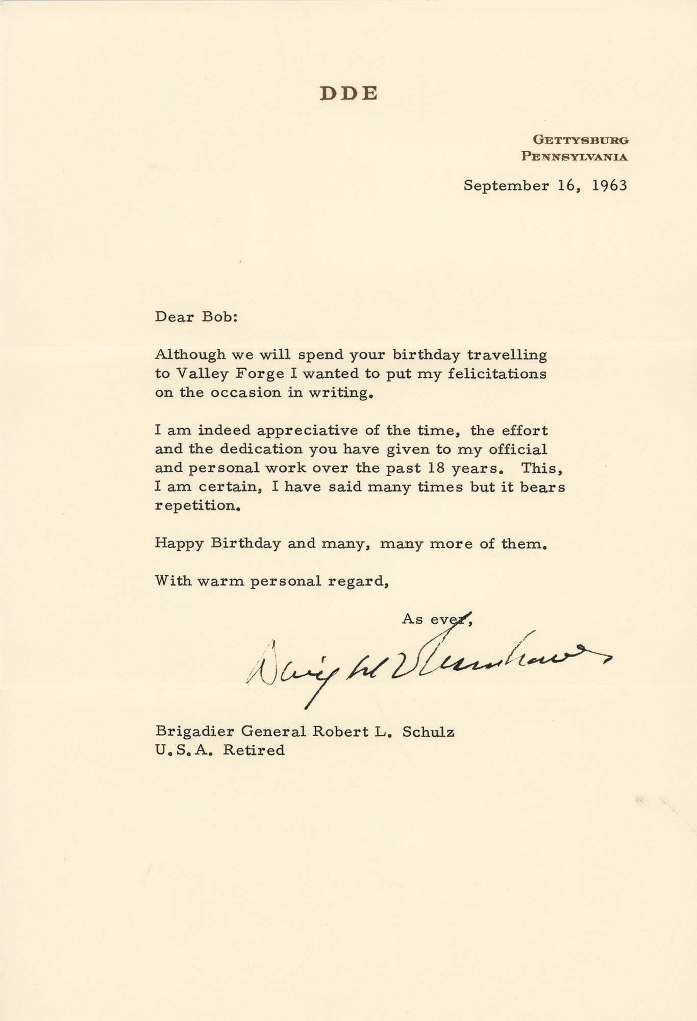 TLS, one page, 7 x 10.25, personal letterhead, September 16, 1963. Letter to Brigadier General Robert L. Schulz, in full: "Although we will spend your birthday travelling to Valley Forge I wanted to put my felicitations on the occasion in writing. I am indeed appreciative of the time, the effort and the dedication you have given to my official and personal work over the past 18 years. This, I am certain, I have said many times but it bears repetition. Happy Birthday and many, many more of them." In fine condition. Connecting three of the major conflicts in United States history, this is a remarkable letter written from Gettysburg, regarding a visit to Valley Forge, and signed by a hero of World War II.