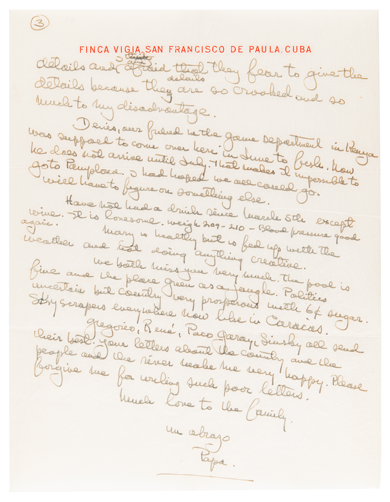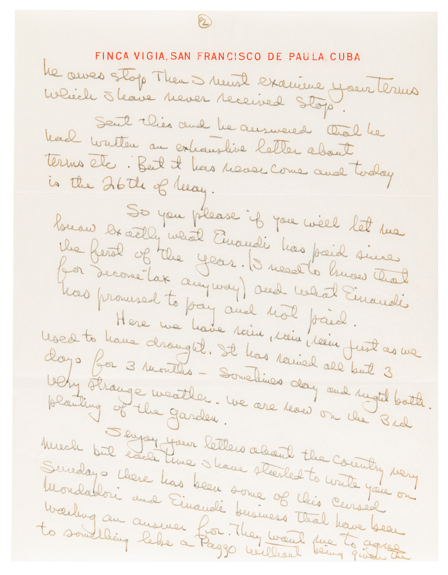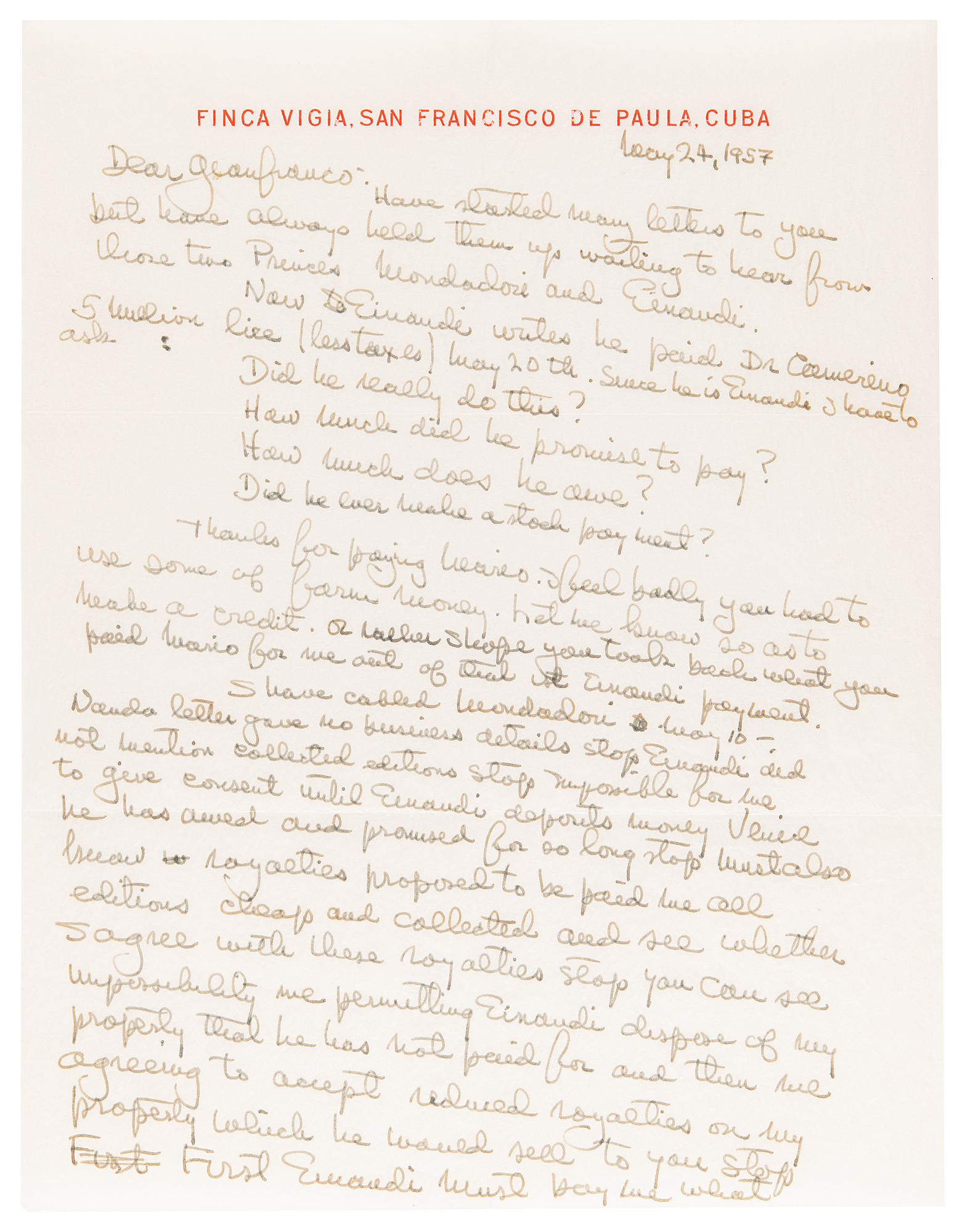 ALS signed “Un abrazo, Papa,” three pages, 8.5 x 11, Finca Vigia (Cuba) letterhead, May 24, 1957. Handwritten letter to his friend Gianfranco Ivancich, in part: “Have started many letters to you but have always held them up waiting to hear from those two Princes Mondadori and Einaudi [the Italian publishers Arnoldo Mondadori and Giulio Einaudi]. Now Einaudi writes he paid Dr. Camerino 5 million lire (less taxes) May 20th. Sure he is Einaudi I have to ask: Did he really do this? / How much did he promise to pay? / How much does he owe? / Did he ever make a stock payment?