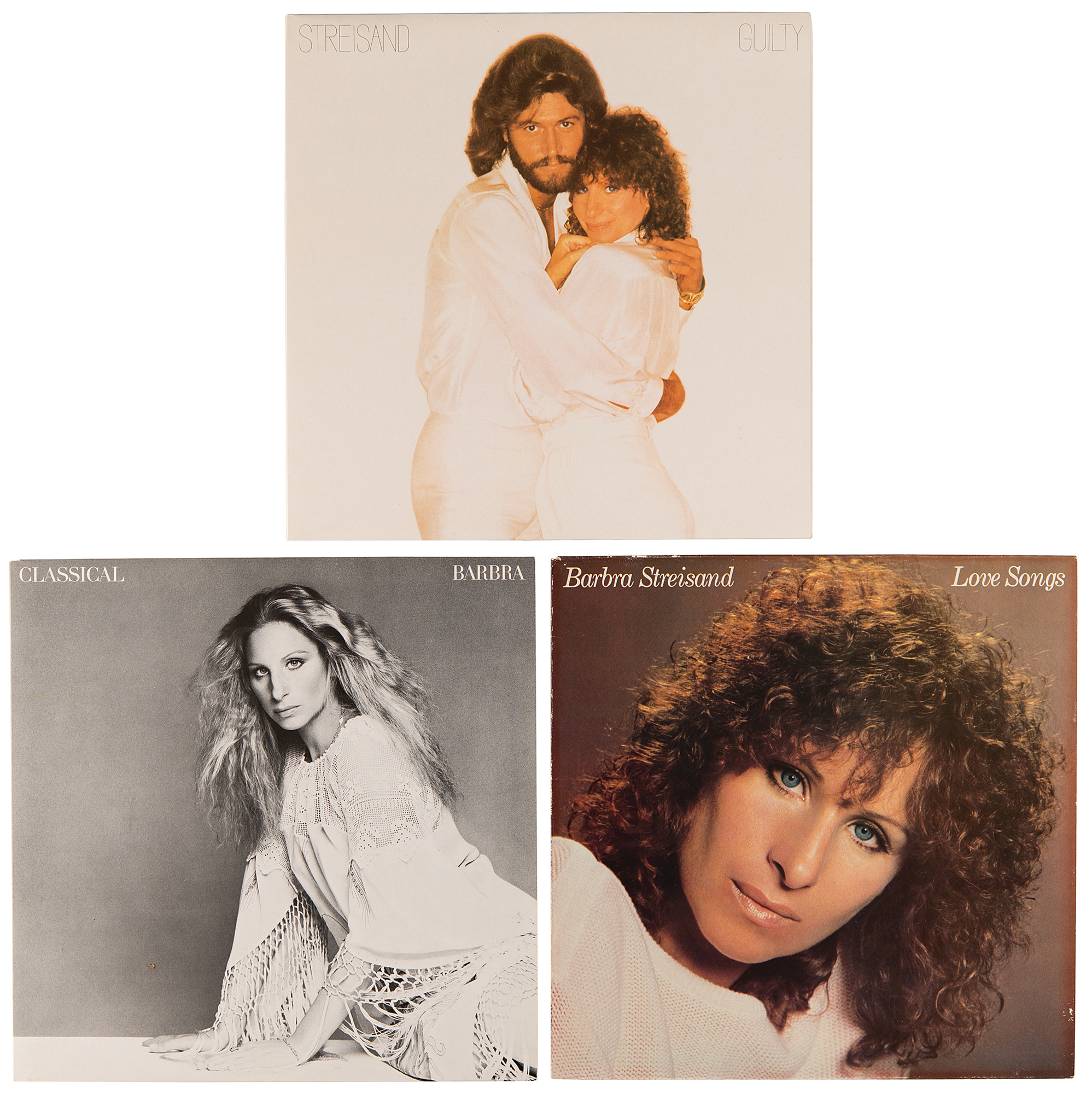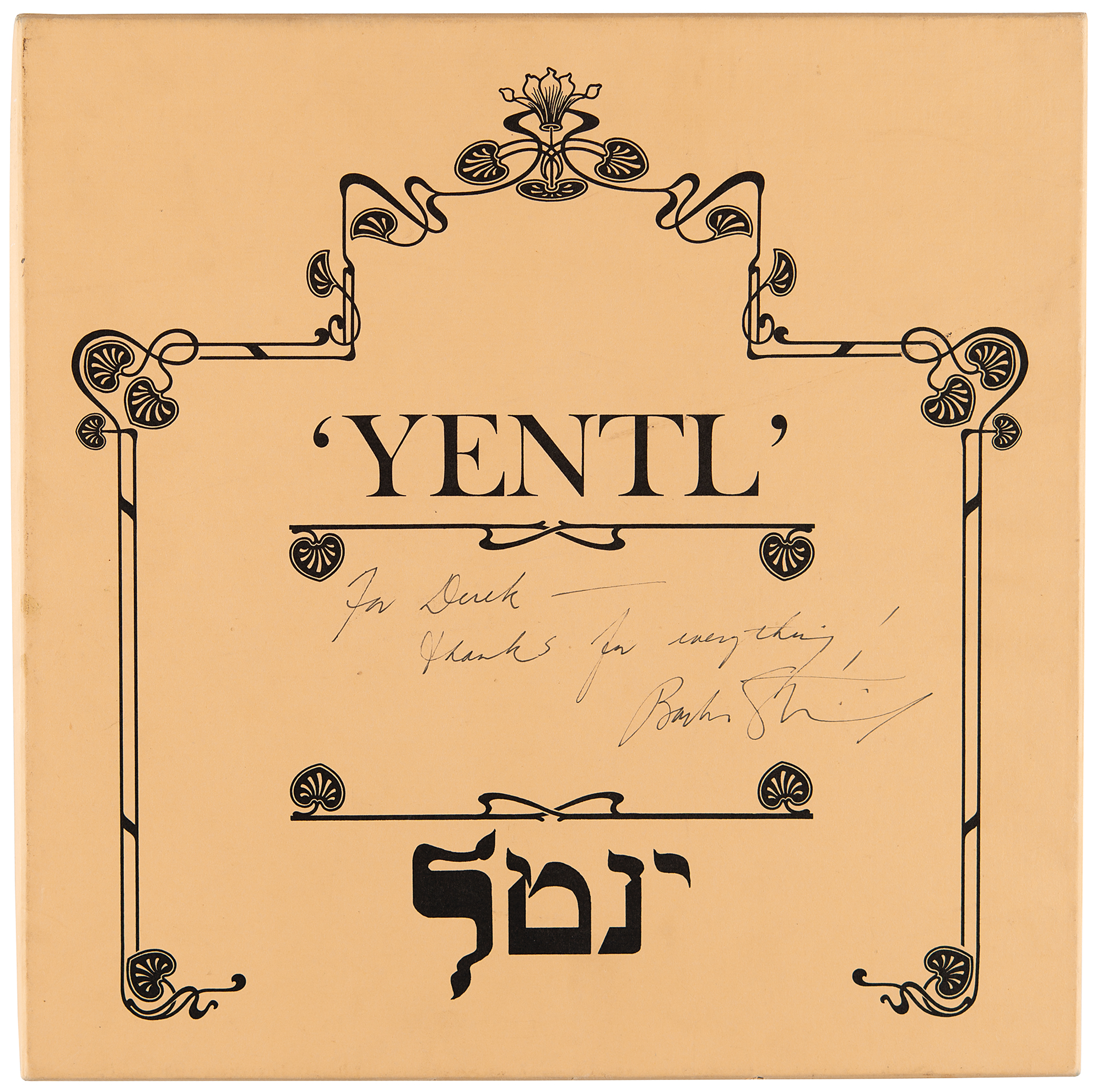 Special edition box set of three promotional Barbra Streisand albums—Love Songs, Classical, and Guilty—distributed to cast and crew members of Yentl (1983), signed and inscribed on the box lid in black felt tip, "For Derek—Thanks for everything! Barbra Streisand." In fine condition, with the front cover of the Love Songs album bearing an impression of Streisand’s handwriting and signature. The records are included.