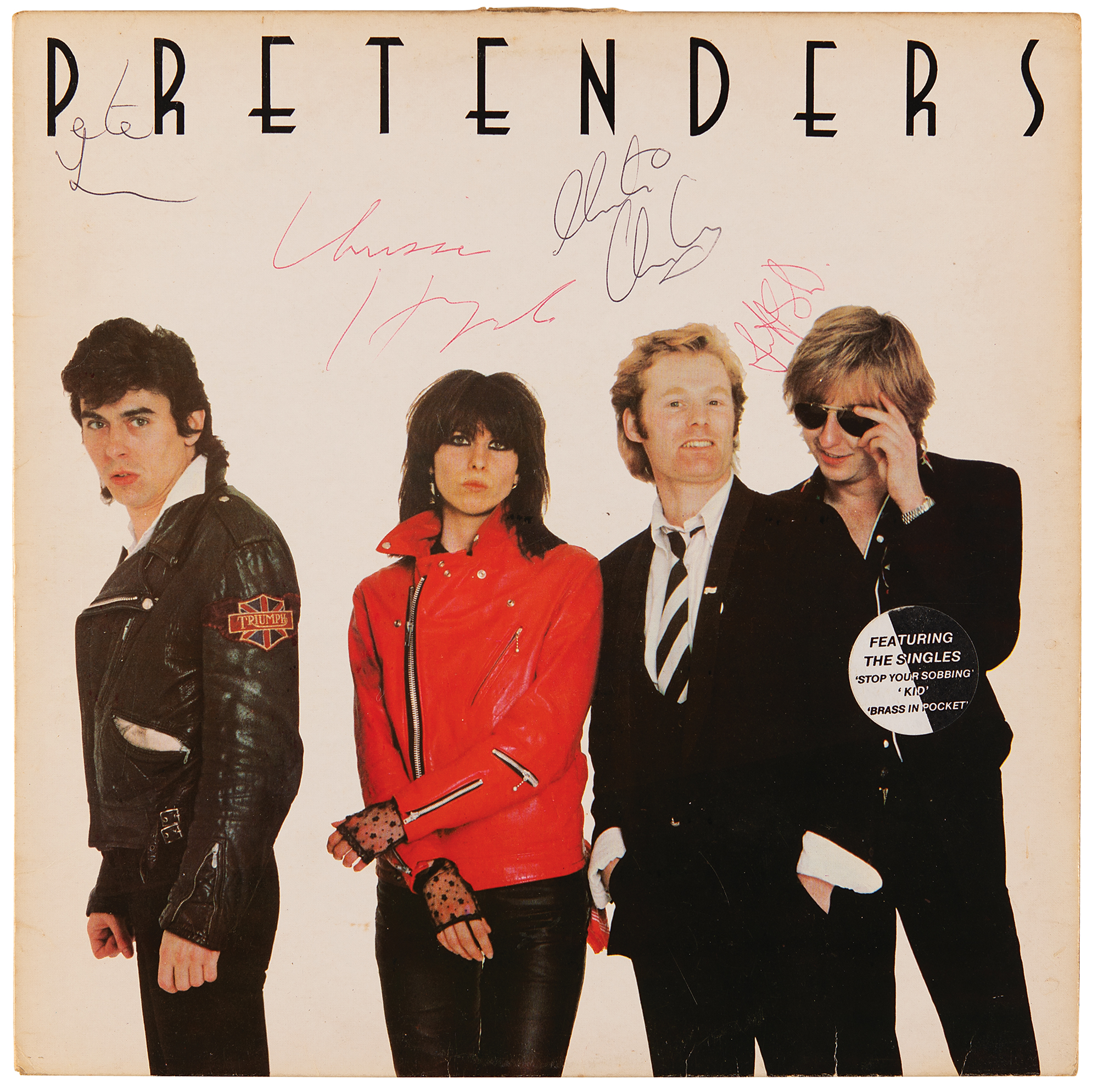 Self-titled debut album by The Pretenders, signed on the front cover in red ballpoint by Chrissie Hynde and James Honeyman-Scott, and in black ballpoint by Martin Chambers and Pete Farndon. In very good to fine condition, with light edge toning, and partial edge separation.