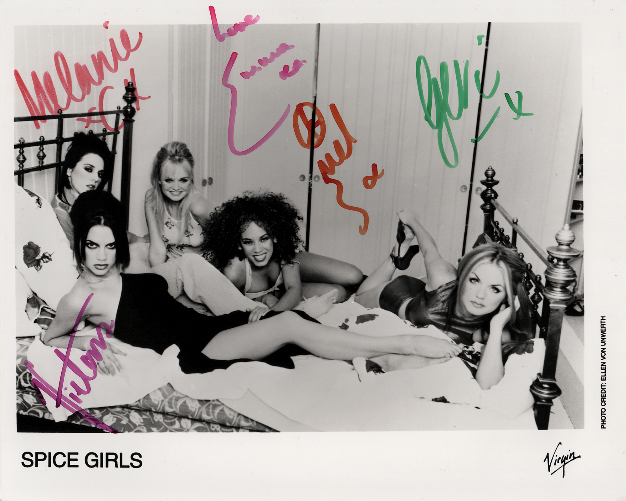 Satin-finish 10 x 8 Virgin Records publicity photo of the Spice Girls, signed in various inks by Victoria Beckham, Melanie Chisholm, Melanie Brown, Geri Halliwell, and Emma Bunton, all signing with first names only. In fine condition.