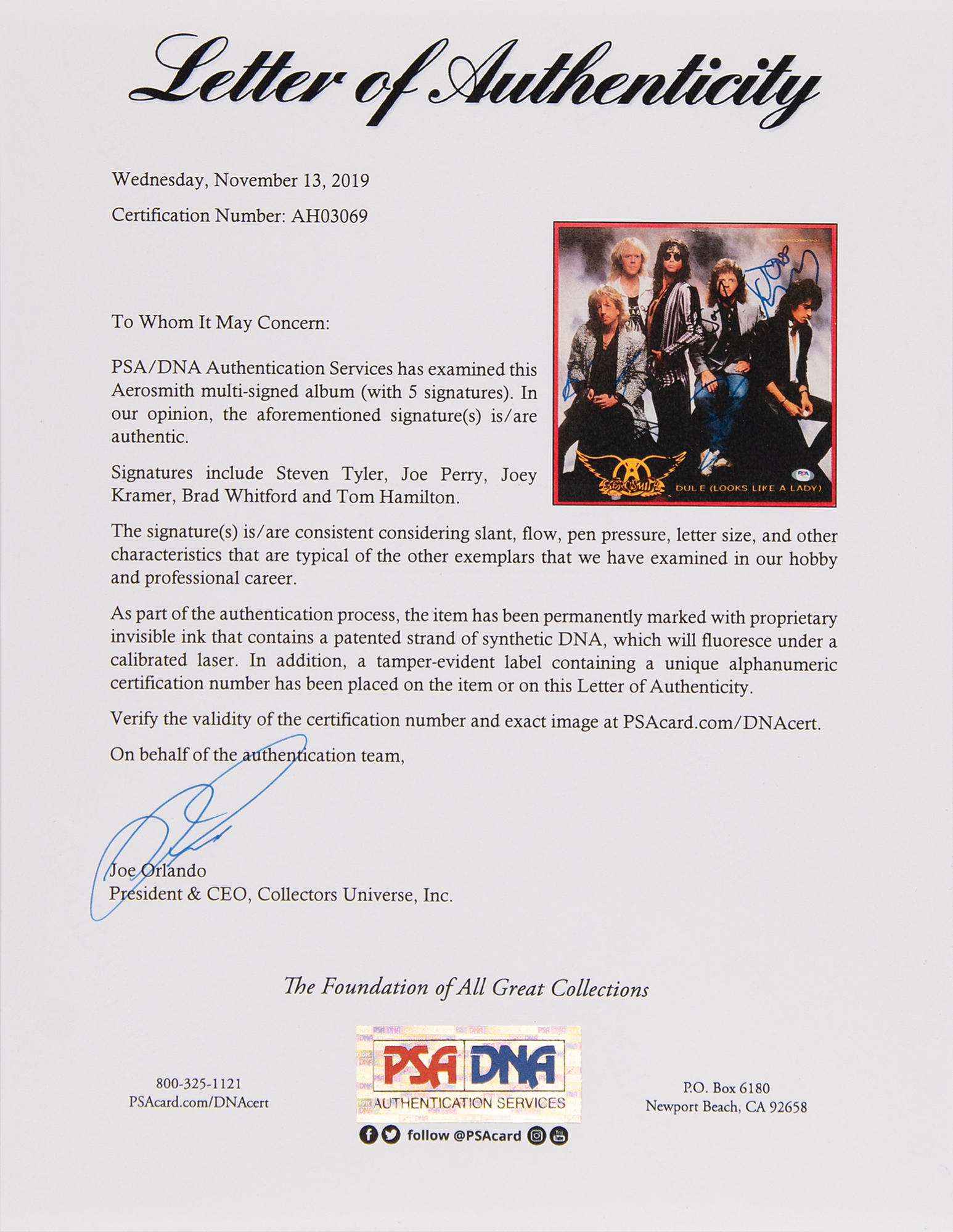 Dude (Looks Like a Lady) 12˝ maxi-single signed on the front cover in blue and black felt tip by Steven Tyler, Joe Perry, Brad Whitford, Joey Kramer, and Tom Hamilton. In fine condition, with a PSA/DNA label affixed to the lower right corner. The record is included. Accompanied by a full letter of authenticity from PSA/DNA.
