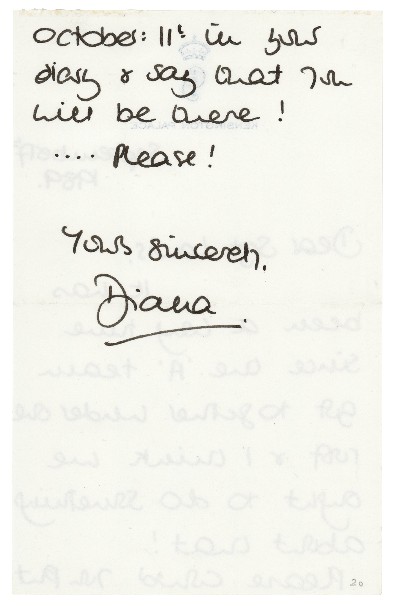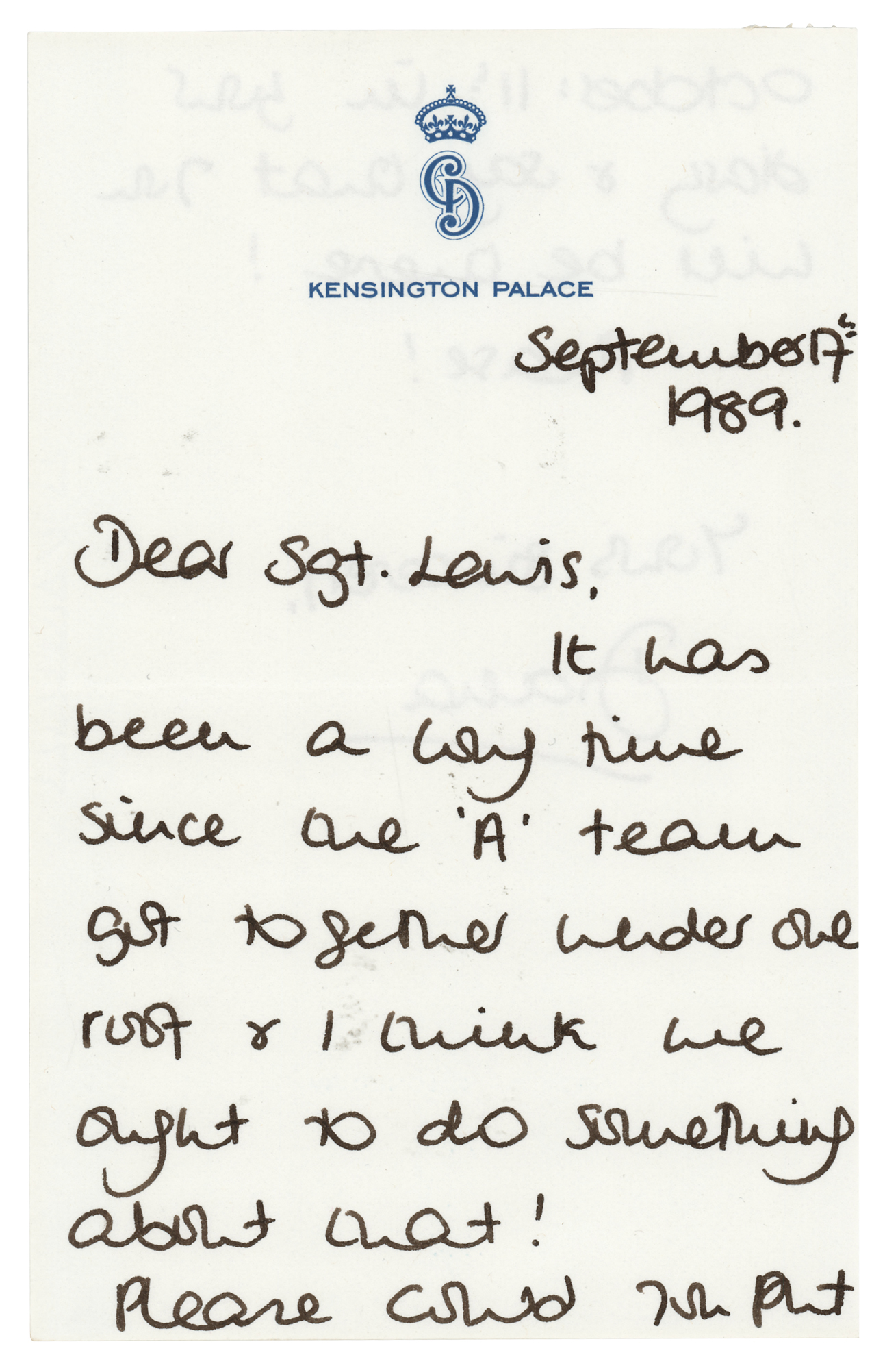 ALS signed “Diana,” one page both sides, 4.75 x 7.5, Kensington Palace letterhead, September 17, 1989. Handwritten letter to her bodyguard, Sgt. Ronald Lewis, in full: "It has been a long time since the 'A' team got together under one roof & I think we ought to do something about that! Please could you put October 11th in your diary & say that you will be there!… Please!" In fine condition. Accompanied by the original transmittal envelope addressed in Diana's hand, "Sgt. Lewis," and initialed, "D.," as well as a color satin-finish 10 x 12 photograph of Princess Diana attending her brother's wedding on September 16, 1989, the day before this letter was written; perhaps seeing friends and family at the wedding inspired her to write this letter, organizing a gathering of old companions.
