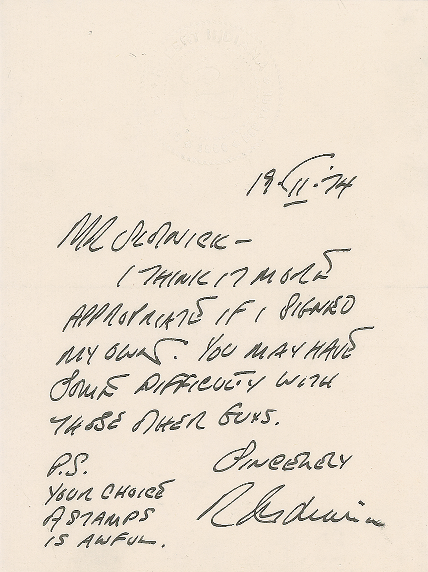 American artist (1928–2018) associated with the pop art movement, known for his iconic "LOVE" design. ALS signed “R. Indiana,” one page, 5.75 x 7.75, blindstamped personal letterhead, February 19, 1974. Handwritten letter to painter Merv Slotnick, in full: "I think it more appropriate if I signed my own. You may have some difficulty with those other guys…P.S. Your choice of stamps is awful." In fine condition. Accompanied by a letter from Slotnick, noting that he had contacted several artists and museum officials about speaking at an annual art teachers' conference; also includes an FDC featuring Indiana's "LOVE" stamp and a metallic cachet, signed in black felt tip by Slotnick, "Indiana loved Maine, RIP Robert, Merv Slotnick. Indiana's jab at the stamp used in the initial correspondence seems to be a reference to the widely distributed "LOVE" stamp issued by the USPS a year earlier in 1973.