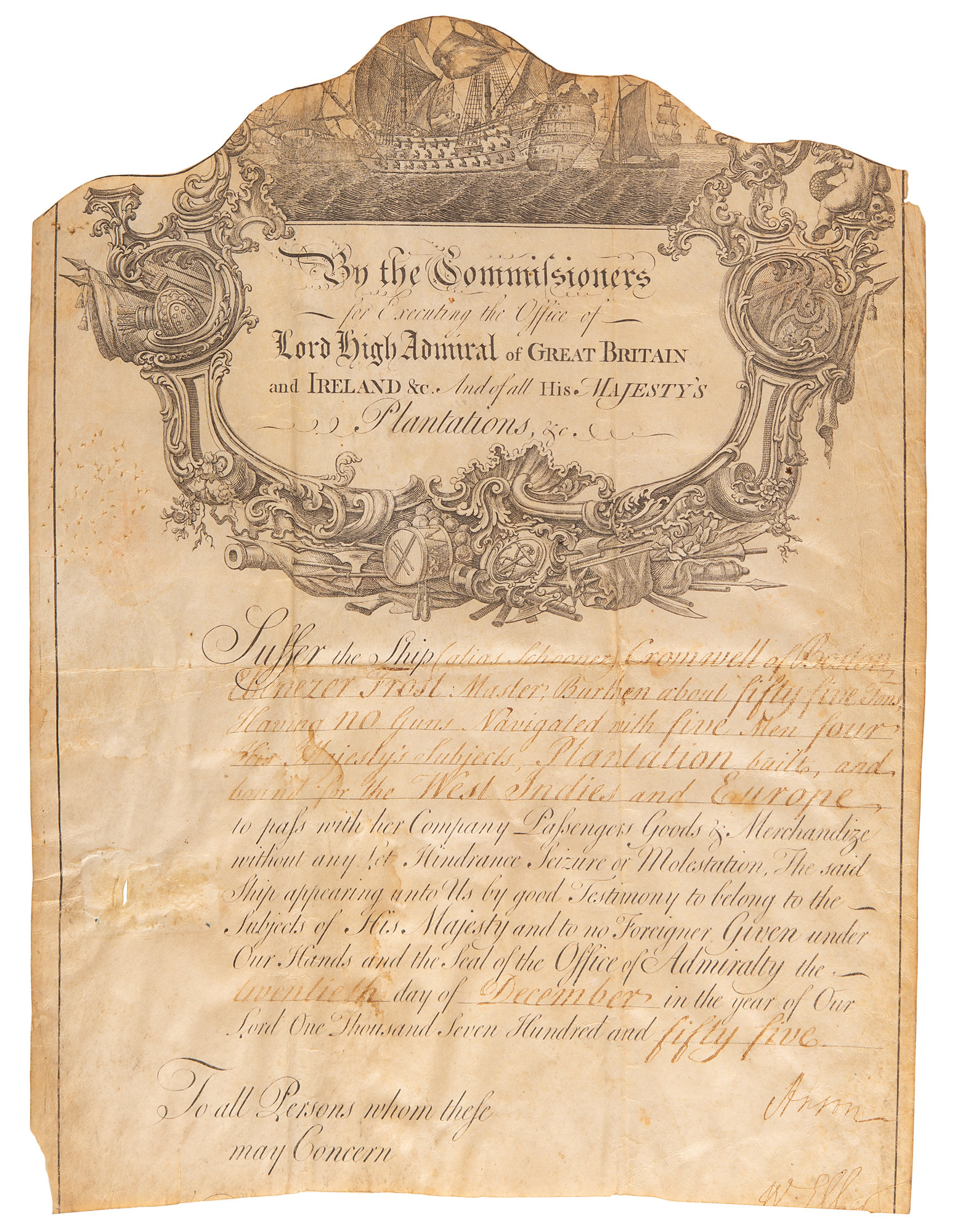 British Royal Navy officer, politician, and peer (1697–1762) who served in the War of the Spanish Succession, War of the Quadruple Alliance, War of the Austrian Succession, and the Seven Years' War; he famously undertook a circumnavigation of the globe during the War of Jenkins' Ear. Partly-printed vellum DS, signed “Anson,” one page, 11.25 x 15, December 20, 1755. Scallop-topped ship's pass issued by the commissioners for executing the office of Lord High Admiral of Great Britain, in part: "Suffer the Ship alias Schooner Cromewell of Boston, Ebenezer Frost Master, Burthen about fifty five tons…bound for the West Indies and Europe, to pass with her Company, Passengers, Goods & Merchandize." Signed at the conclusion in ink by George Anson, and endorsed on the reverse by Spencer Phips as lieutenant governor of Massachusetts. In very good to fine condition, with overall rippling, and dampstaining to the left side.