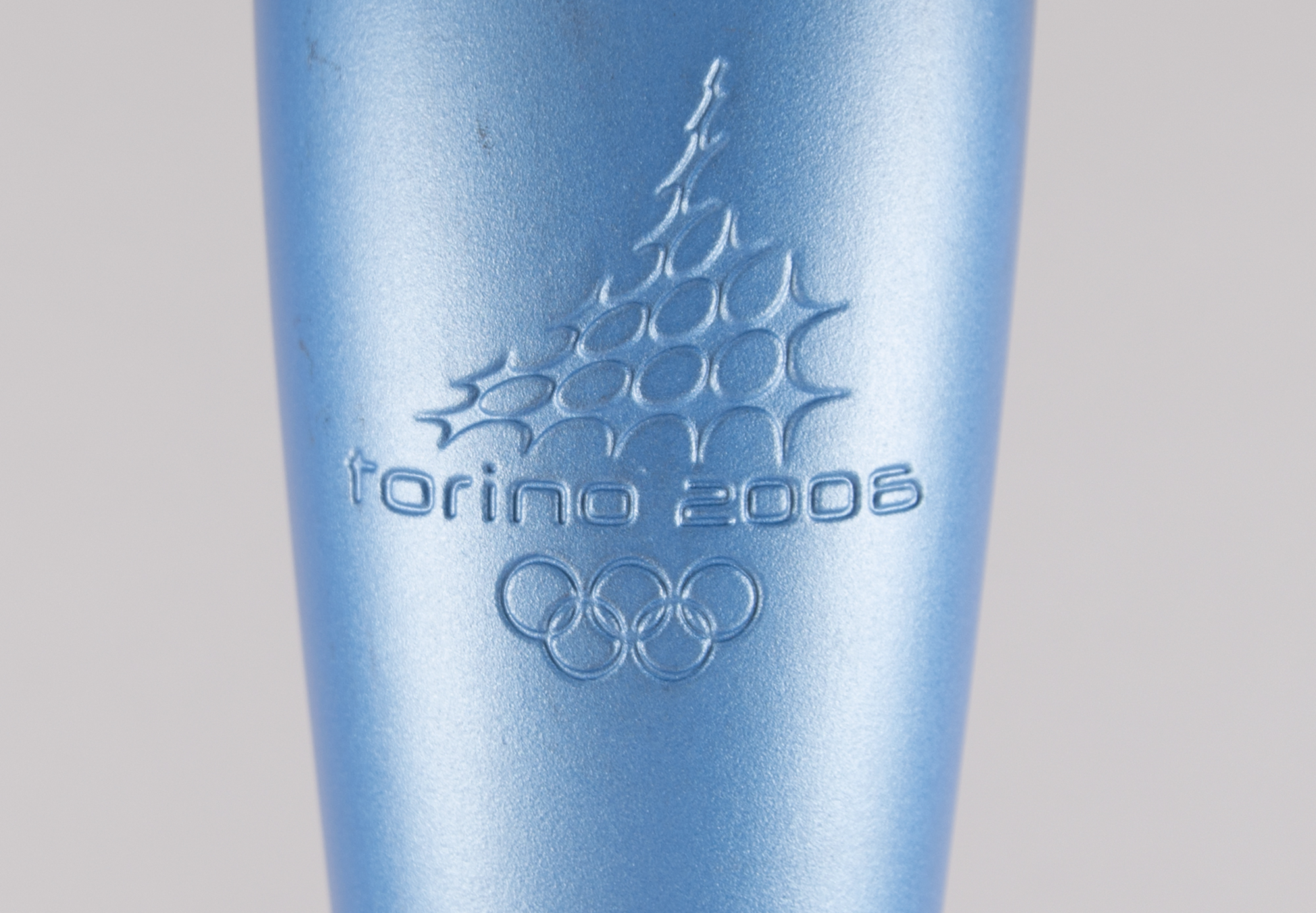 Official 2006 Torino Winter Olympics torch, constructed of blue techno-polymer-coated aluminum, measuring 31.25″ in length and 4.5″ at its widest point. Designed by Pininfarina, the shape of the torch was designed to appear like a ski tip, while also representing the monument and symbol of Turin, the Mole Antonelliana. Additionally, the design was intended to replicate the traditional wooden torch, giving the impression that the metal itself catches fire and burns. The middle portion of the torch bears an inscription of the Torino Games emblem with Olympic rings. Exhibits light wear from use.