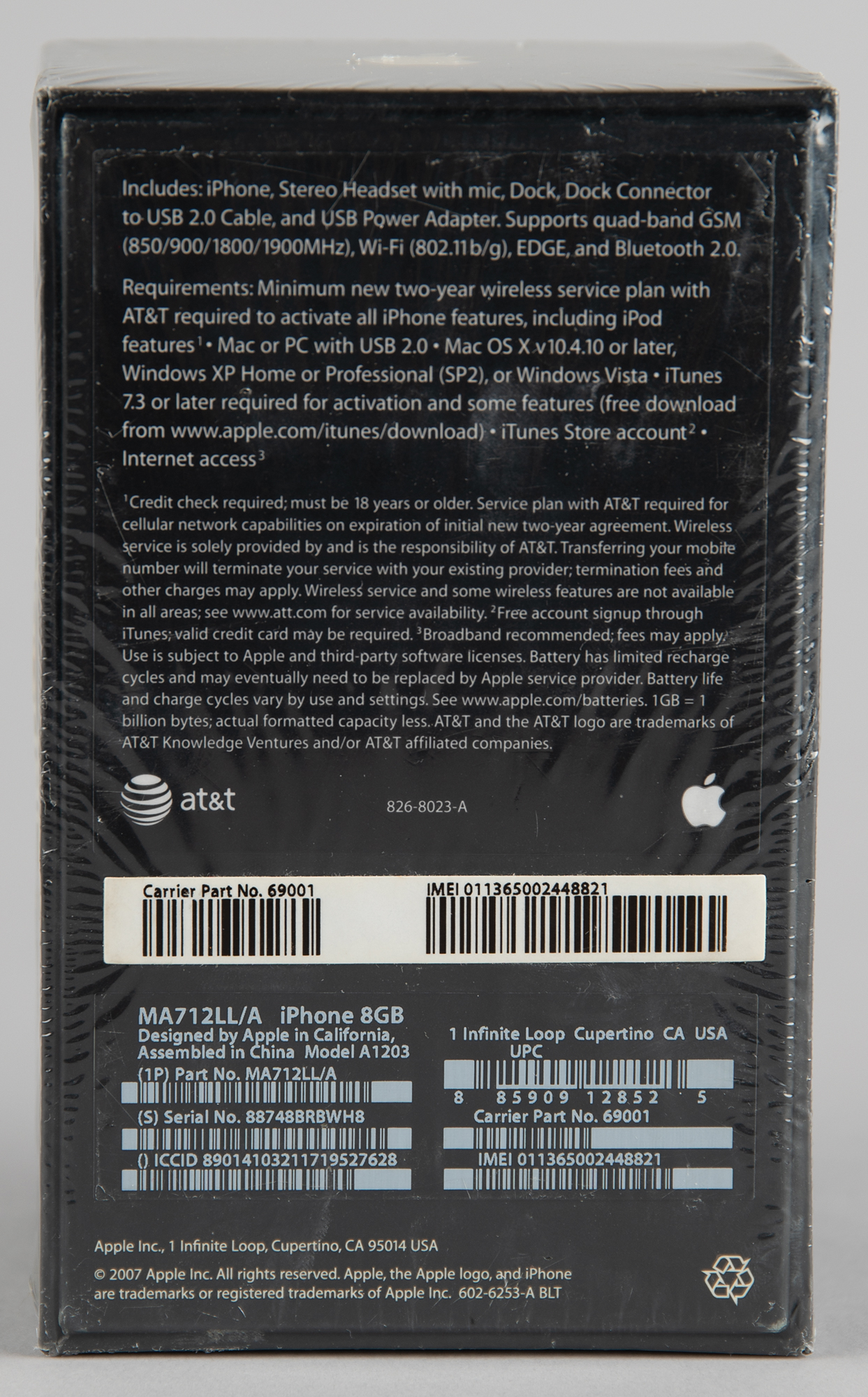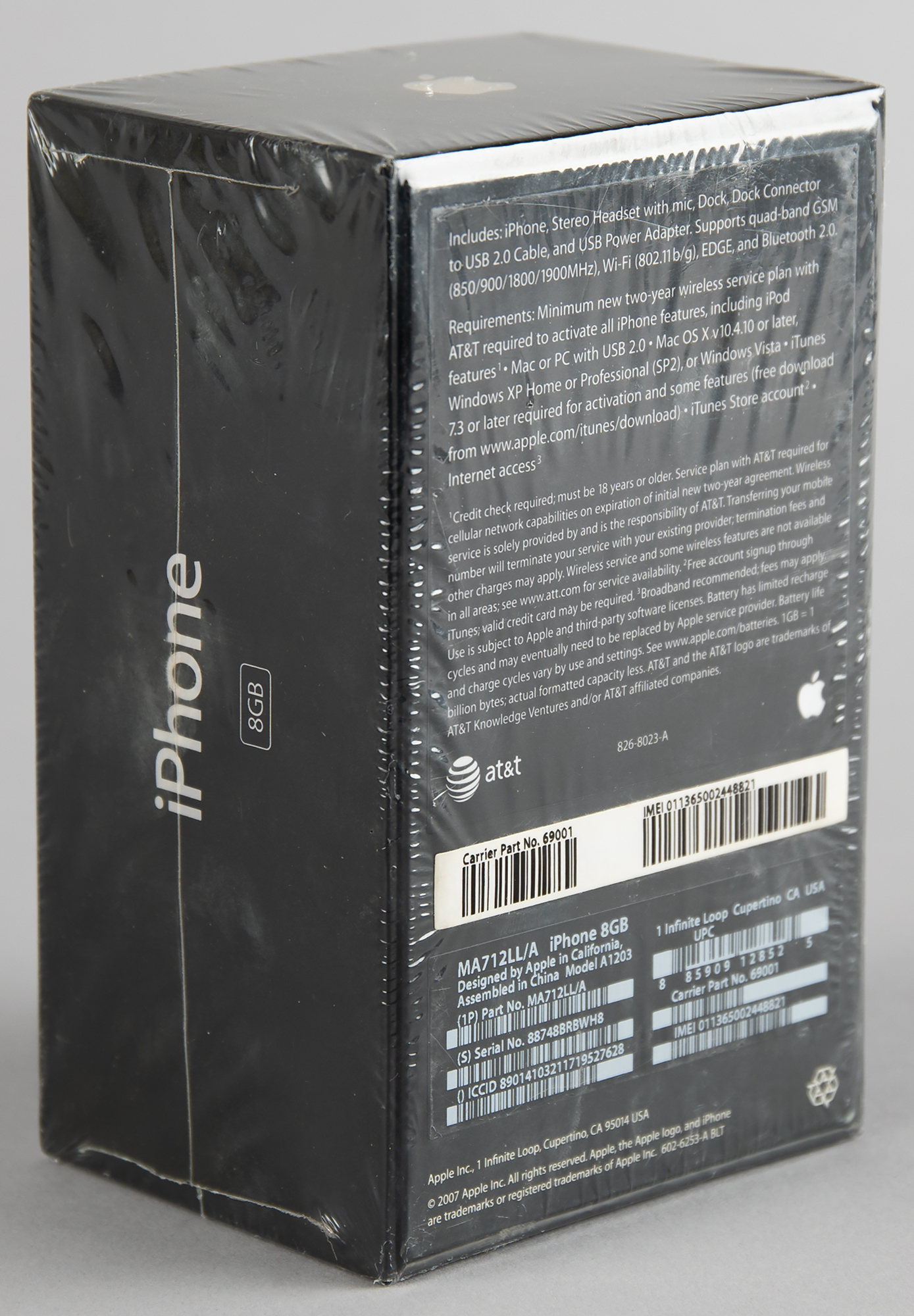 Unopened first generation original Apple iPhone, Model A1203, Part No. MA712LL/A (8GB), Serial No. 88748BRBWH8. The box features a life-size image of the iPhone with thirteen icons on the screen, indicating that it is from the later production run of original iPhones; the 13th icon, for iTunes, was introduced to the packaging in late 2007. In brand new, factory-sealed condition.