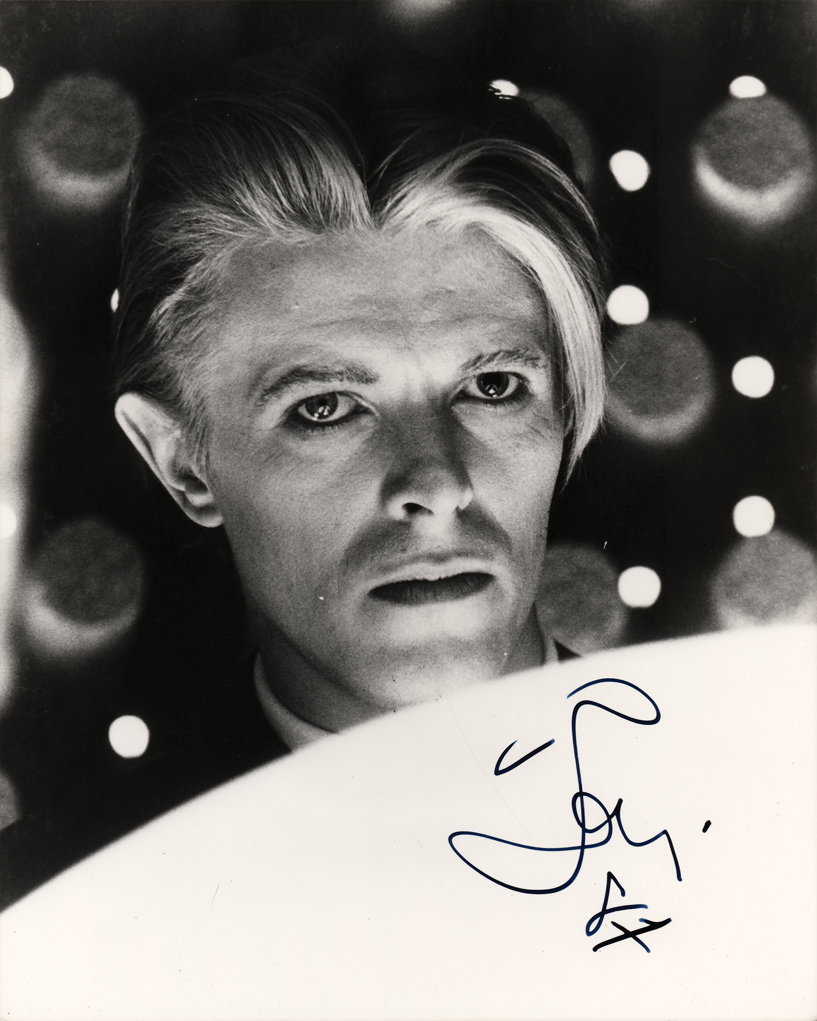 Marvelous glossy 8 x 10 photo of David Bowie as humanoid alien Thomas Jerome Newton in the 1976 sci-fi drama The Man Who Fell to Earth, beautifully signed and dated in fountain pen, "Bowie, 87." In very fine condition. Bowie's first starring film role, The Man Who Fell to Earth remains a cult classic.